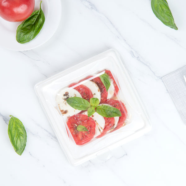 Protect takeout orders with our Pulp Tek Square Clear Plastic Dome Lids. Coordinate our small bagasse plates with lids to keep foods securely sealed to prevent messes during transport. Featuring a dome design, these food container lids provide ample space for adding toppings to your desserts, appetizers, side dishes, and treats. The built-in tab of these dome lids allows you to easily remove them from plates so you can access dishes in no time. With a crystal clear finish, these square lids give you a full view of fare to avoid order mix-ups. Constructed from PET plastic, these durable lids are shatterproof to keep foods intact and ready to enjoy. To shorten your cleaning process, these clear plastic lids are recyclable. These clear dome lids measure 6.45 inches in length and 1.57 inches in height. Sold in a 100 count box. Sugarcane plates (SKU: RWA0188) are available and sold separately.