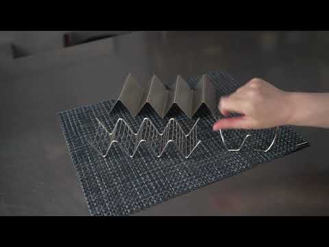Use this convertible Met Lux Quattro Stainless Steel Taco Rack Stand to serve three or four of your mouthwatering tacos at once! Featuring a slatted bar design, this taco shell holder securely holds tacos in place while you prep, assemble, and serve them. The high-shine polished finish expertly enhances your food presentation, while the modern design-inspired shape adds a unique touch to any setting. Constructed from incredibly durable stainless steel, this taco tray is built to resist warping or denting during high-volume commercial use. Each of these stainless steel taco holders measures 7.1 inches long by 2.5 inches wide and stands 1.5 inches tall. Suitable for use as a hard or soft taco holder, this taco rack can hold 3 or 4 tacos depending on how you place it. Sold in a 1 count box.