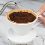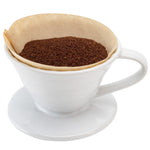 Extract all the bold and rich flavors of ground coffee with our Restpresso 10-ounce White Ceramic Coffee Dripper. Made from heat-resistant ceramic, this coffee dripper maintains the temperature of water throughout every step of the brewing process. This pour over dripper has 1 hole that helps prevent water from flowing through too quickly for optimal extraction and flavors of coffee. Featuring spiral sidewalls, this coffee dripper extracts the flavors from beans to accentuate the flavor notes in each cup of coffee. With a built-in handle, this ceramic coffee dripper keeps your hands cool when brewing coffee for customers. This ceramic pour over dripper has a white finish that perfectly matches the coffee equipment at your foodservice establishment. Containing up to 10 ounces, this white coffee dripper measures 4 inches in diameter by 3 inches in height. This dripper can brew 1 to 2 cups of coffee and is compatible with our unbleached coffee filter (SKU: RWA0921K). Sold in a 1 count box.