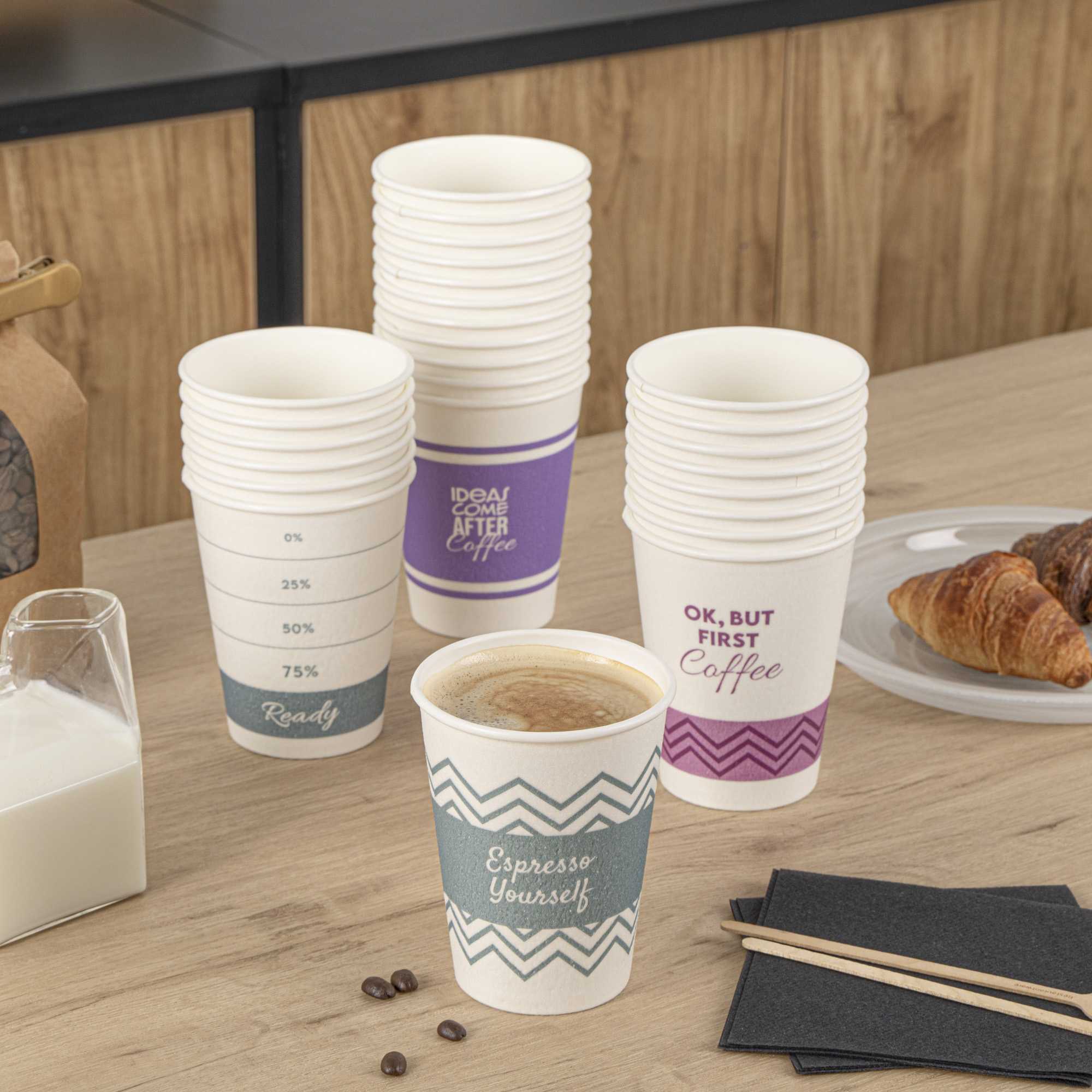 Simplify your beverage service with our Restpresso 12 oz Assorted Paper Insulated Hot Cup Set. These non-slip cups offer exceptional heat retention, keeping drinks hot and hands cool, ideal for any busy café environment. The reliable single-wall design eliminates the need for double-cupping, creating an efficient and waste-reducing solution. With their comfortable grip, these paper cups help prevent beverage spills, maintaining cleanliness in fast-paced settings. These versatile disposable coffee cups are freezer-friendly, making them the perfect choice for storing cold drinks and smoothies, while the recyclable paper construction underscores their commitment to sustainability. Streamline your inventory with these dual-purpose options that save you space and simplify ordering. Measuring 2.32 inches in diameter and 4.33 inches in height, these cups strike the perfect balance between portability and capacity. Sold in a 100 count box.