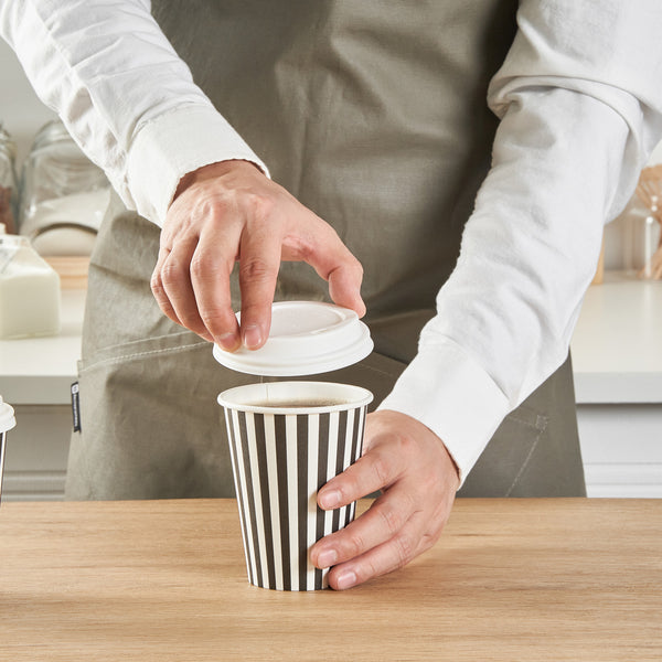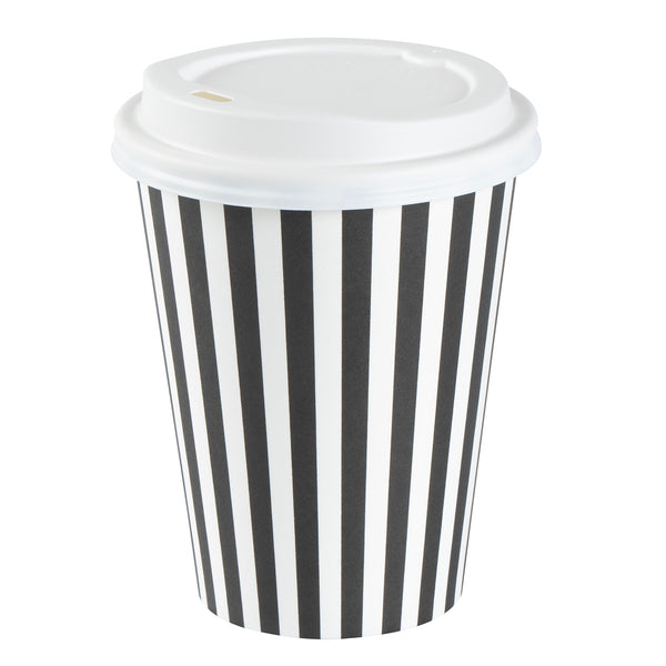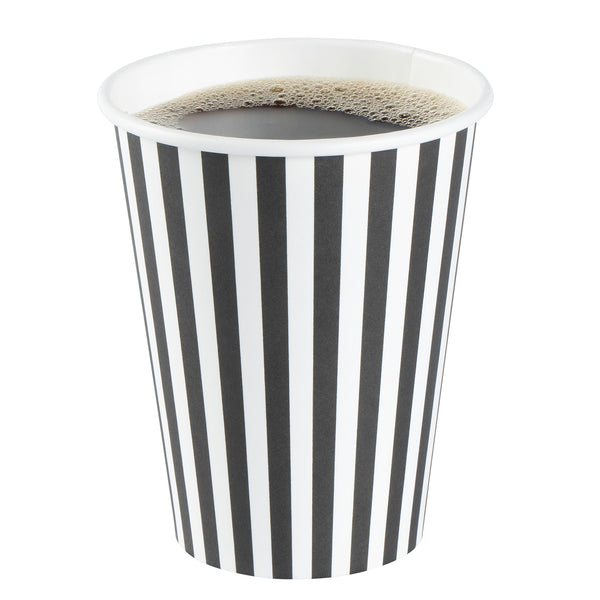 Upgrade your coffee service with our Restpresso 12-ounce Black and White Stripe Paper Single Wall Coffee Cups. These paper coffee cups are greaseproof with a PE liner, ensuring a streamlined experience for your customers. These disposable hot cups are perfect for on-the-go sipping, as they come with a white leak-resistant lid that securely fits on top. These single wall coffee cups are designed to hold both hot and cold drinks, making them versatile for any beverage offering. Showcasing a stylish black and white striped finish, these coffee cups are perfect for adding a touch of elegance to your establishment. These stackable single use coffee cups save valuable counter space and make storage a breeze. The rolled rim and leak-resistant seam of these recyclable hot tea cups ensure durability and functionality, making them a must-have for your coffee shop or bakery. Match these coffee cups with our array of sleeves for a comfortable and heat-resistant coffee break. These 12-ounce coffee cups measure 3.5 inches in diameter by 4.5 inches in height, providing ample room for your favorite beverages. Sold in a 400 count box. Sleeves are available and sold separately.