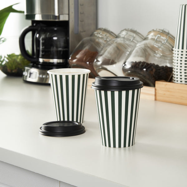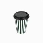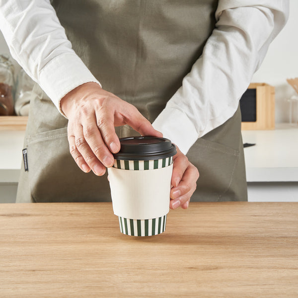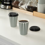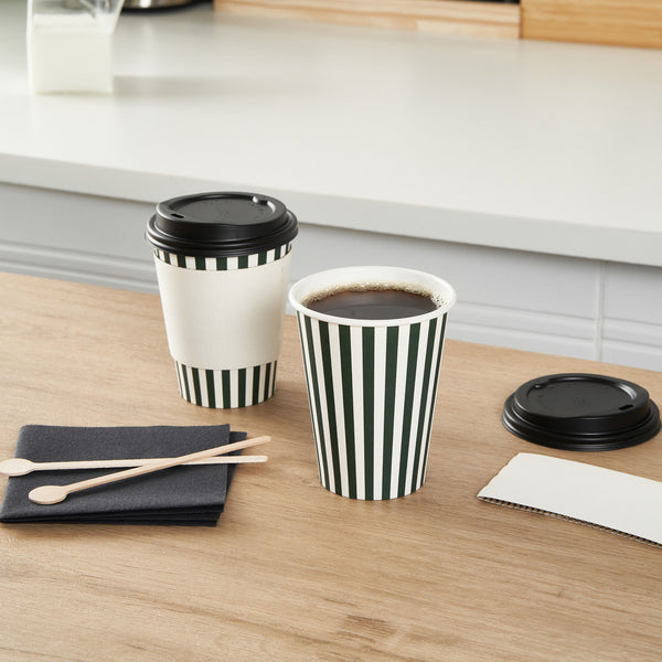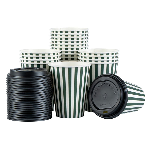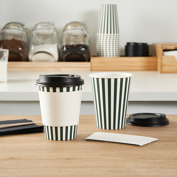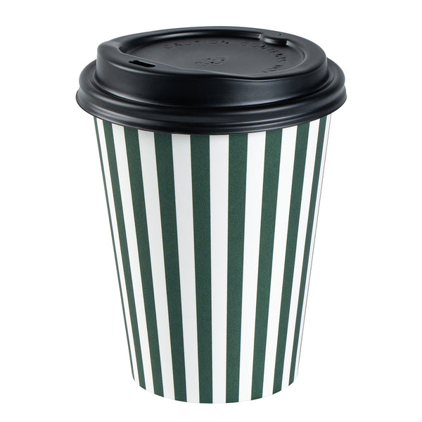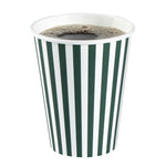 Upgrade your to-go coffee service with our Restpresso 12-ounce Forest Green and White Stripe Paper Single Wall Coffee Cups. Featuring a greaseproof design, these paper coffee cups are lined with PE material to keep beverages hot or cold without compromising the integrity of the cup. Boasting a stylish forest green and white striped finish, these disposable hot cups add a touch of elegance to any drink served at your cafe or bakery. Effortlessly stackable, these single wall coffee cups optimize storage space and ensure quick access during busy hours. The rolled rim of these recyclable hot tea cups provides a secure fit for the included black lid, while the leak-resistant seam ensures a mess-free experience for your customers. Match these coffee cups with our assortment of cup sleeves designed to enhance grip, minimizing accidental spills or slips. With a 12-ounce capacity, these single-use coffee cups are perfect for serving a variety of hot and cold beverages and measure 3.5 inches in diameter by 4.5 inches in height. Sold in a 20 count box. Sleeves are available and sold separately.