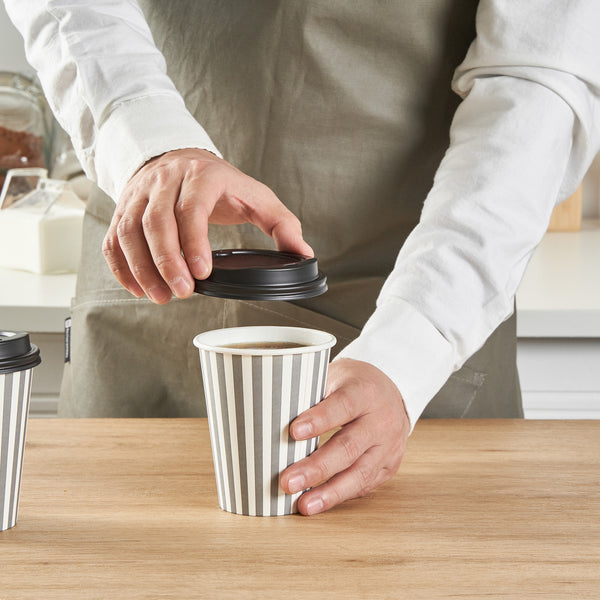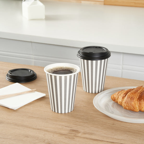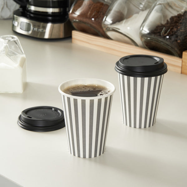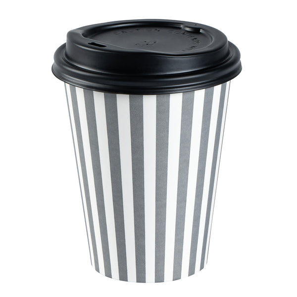 Start your day with our Restpresso 12-ounce Gray and White Stripe Paper Single Wall Coffee Cups. These paper coffee cups are designed with a tasteful gray and white stripe pattern, adding a touch of sophistication to your morning routine. Made of greaseproof paper and equipped with a PE liner, these disposable hot cups avert leaks and stains, ensuring a smooth, enjoyable coffee experience. These single wall coffee cups are versatile, accommodating both hot and cold beverages with ease. Plus, these coffee cups include a black lid, providing seamless transport for your on-the-go customers. Stackable by design, these recyclable hot tea cups maximize storage space in your cafe, food truck, or coffee station. The rolled rim and leak-resistant seam of these beverage cups make for secure, comfortable sipping. Pair these coffee cups with our range of cup sleeves aimed at improving grip, thus reducing the risk of spills or slips. These striped coffee cups boast a generous capacity of 12 ounces, perfect for a rejuvenating morning coffee or an afternoon pick-me-up. Measuring 3.5 inches in diameter by 4.5 inches in height, these stackable coffee cups are compact yet able to hold a satisfying serving of your favorite brew. Sold in a 20 count box. Sleeves are available and sold separately.