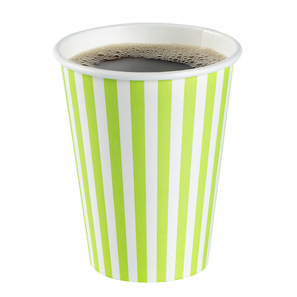 Start your day with our Restpresso 12-ounce Green and White Stripe Paper Single Wall Coffee Cups. These paper coffee cups are designed with a greaseproof PE liner, ensuring your beverage stays hot while your hands stay comfortable. The leakproof black lid of these cups for coffee are perfect for your on-the-go beverages. Add a touch of style to your morning routine with these disposable paper coffee cups' distinctive green and white striped finish, a standout in the world of disposable hot cups. Single wall construction offers a lightweight yet sturdy solution for on-the-go coffee drinkers. These coffee cups are suitable for hot and cold drinks, making them a versatile addition to any cafe or restaurant. With their rolled rim and leak-resistant seam, these single-use coffee cups provide a secure, comfortable drinking experience. These stackable coffee cups save valuable counter space in your busy establishment. Combine these coffee cups with our variety of cup sleeves engineered for better grip, decreasing the likelihood of accidental spills or slips. With a capacity of 12 ounces, these single wall coffee cups are just the right size for a satisfying cup of joe. Measuring 3.5 inches in diameter by 4.5 inches in height, these recyclable hot tea cups have a compact design that fits comfortably in most car cup holders and coffee machines. Sold in a 400 count box. Sleeves are available and sold separately.