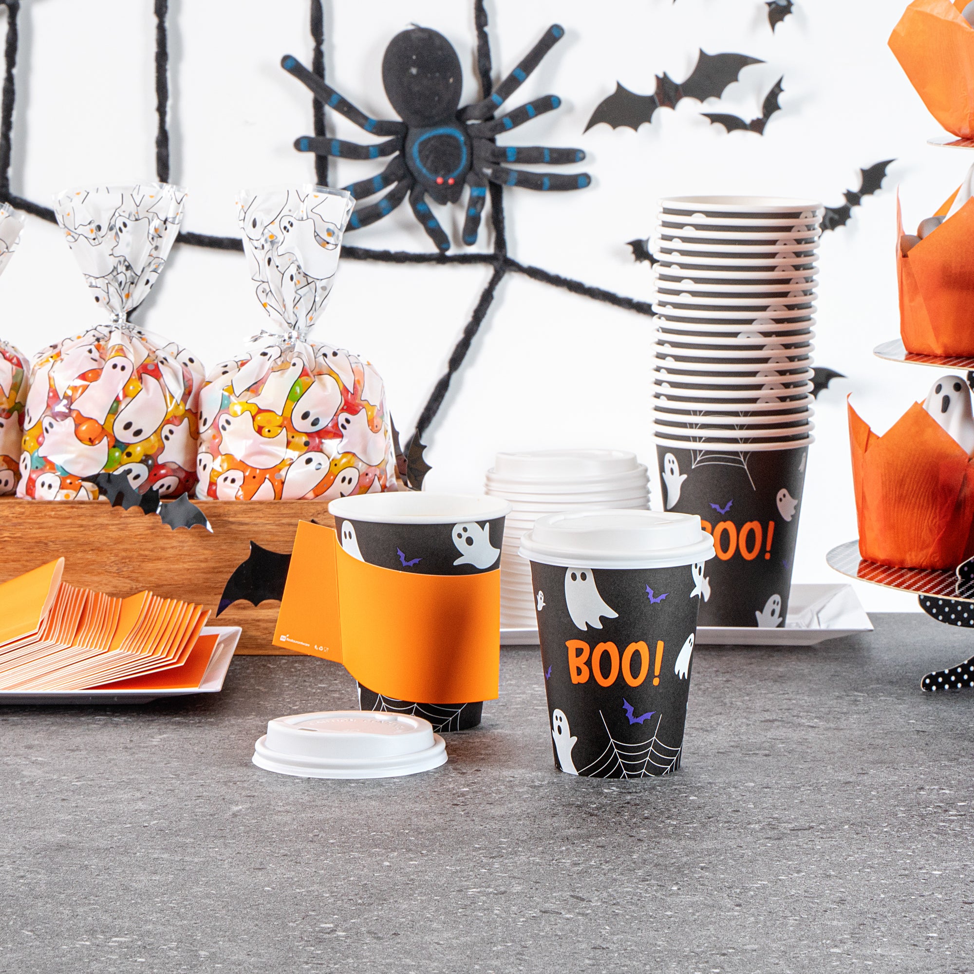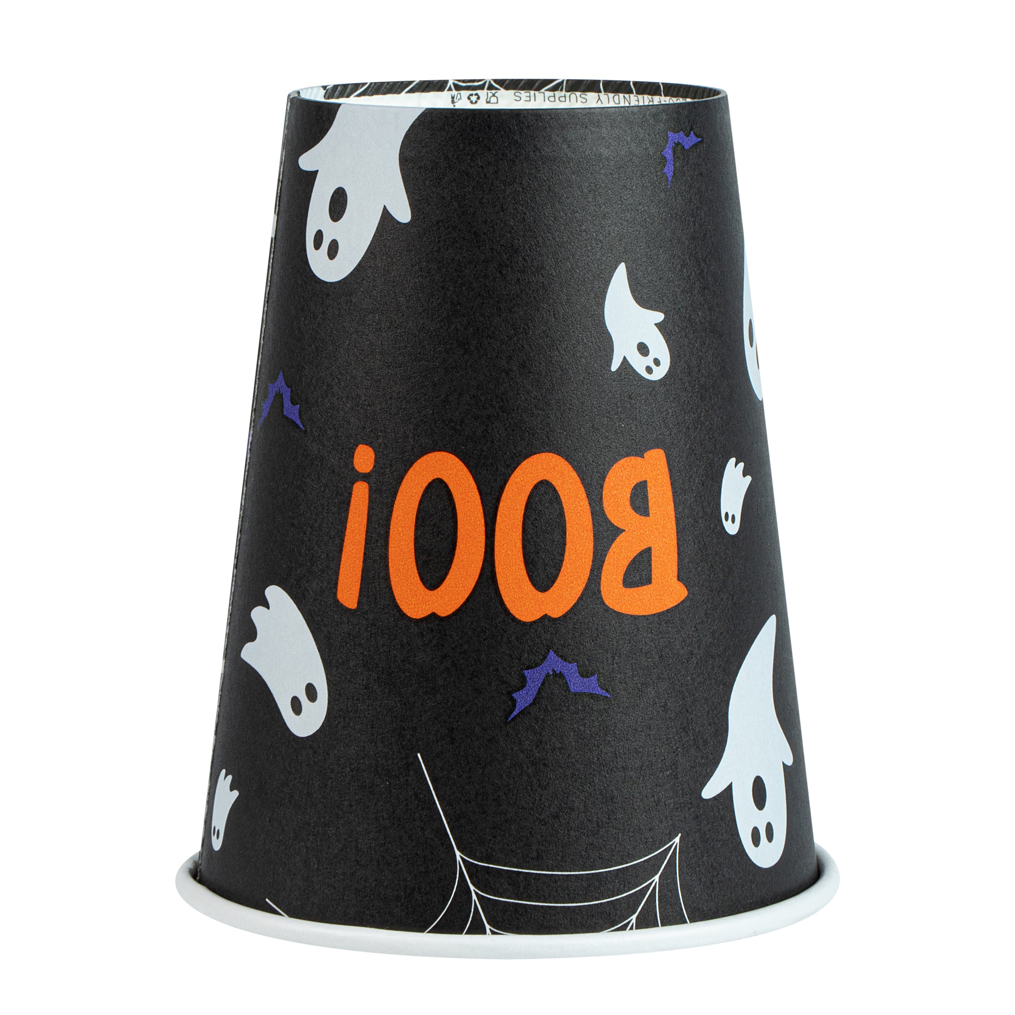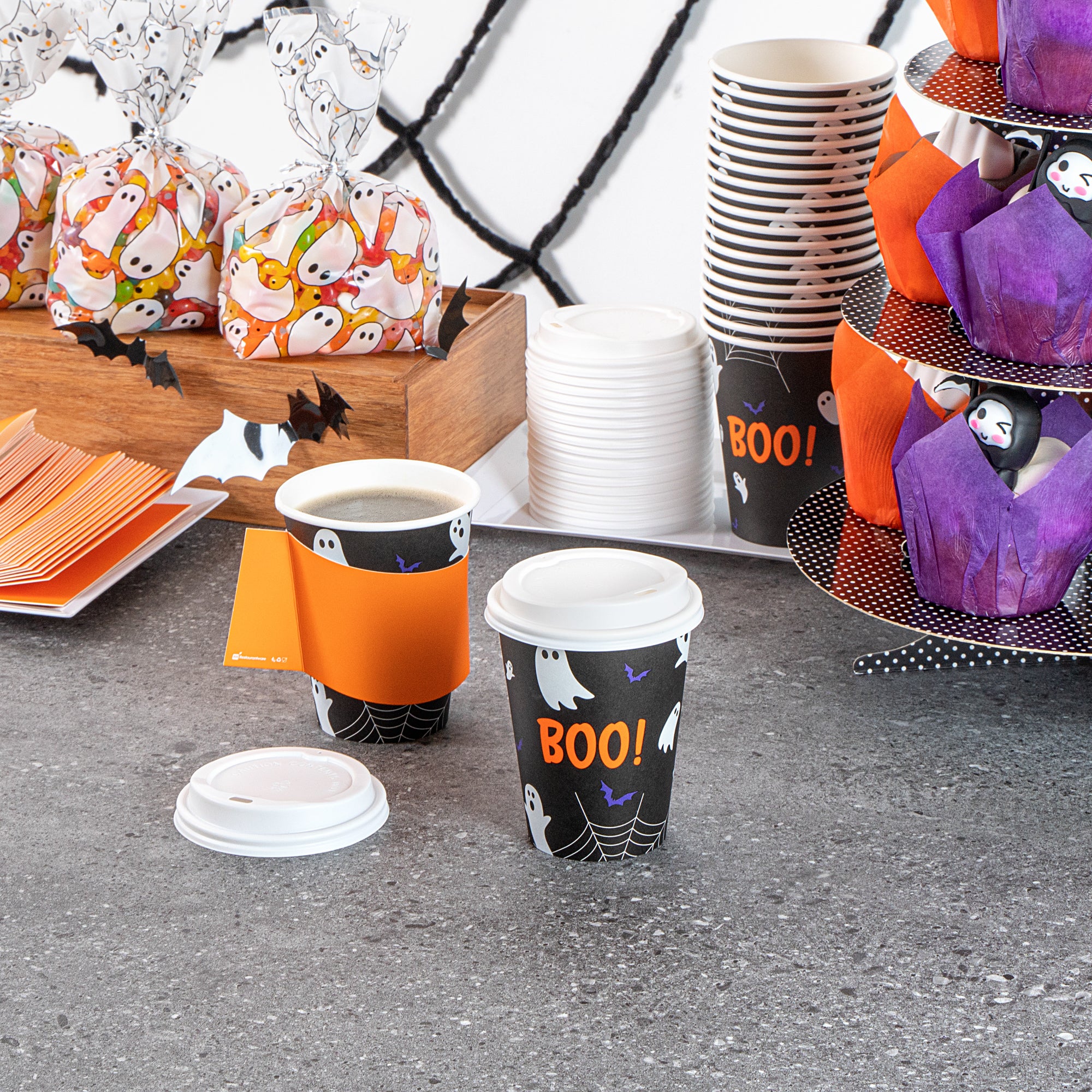 Embrace the spooky season with our Restpresso 12-ounce Halloween Paper Single Wall Coffee Cups. These disposable coffee cups come equipped with white plastic lids that form a secure seal and prevent spills, ideal for an on-the-go sipping experience. Featuring whimsical floating ghosts and the word "Boo," these hot cups with lids add a touch of spooky charm to your favorite drinks as you revel in the magic of the season's festivities. The greaseproof PE lining of these paper coffee cups ensures a mess-free drinking experience for your guests. Designed with a rolled rim, these hot drink cups provide a smooth flow of beverages with every sip. Crafted from premium paper, these 12-ounce coffee cups are durable and ideal for serving hot and cold beverages. The leak-resistant seams of these coffee cups with lids minimize the risk of potential leaks, making them ideal for busy mornings. Adorned with a “recycle me” message on the bottom, these disposable cups for coffee encourage guests to dispose of them in a planet-friendly way. These coffee cups are disposable and can be discarded quickly after use. Measuring 3.5 inches in diameter by 4.68 inches in height, these disposable paper cups have a capacity of 12 ounces. Sold in a 400 count box.