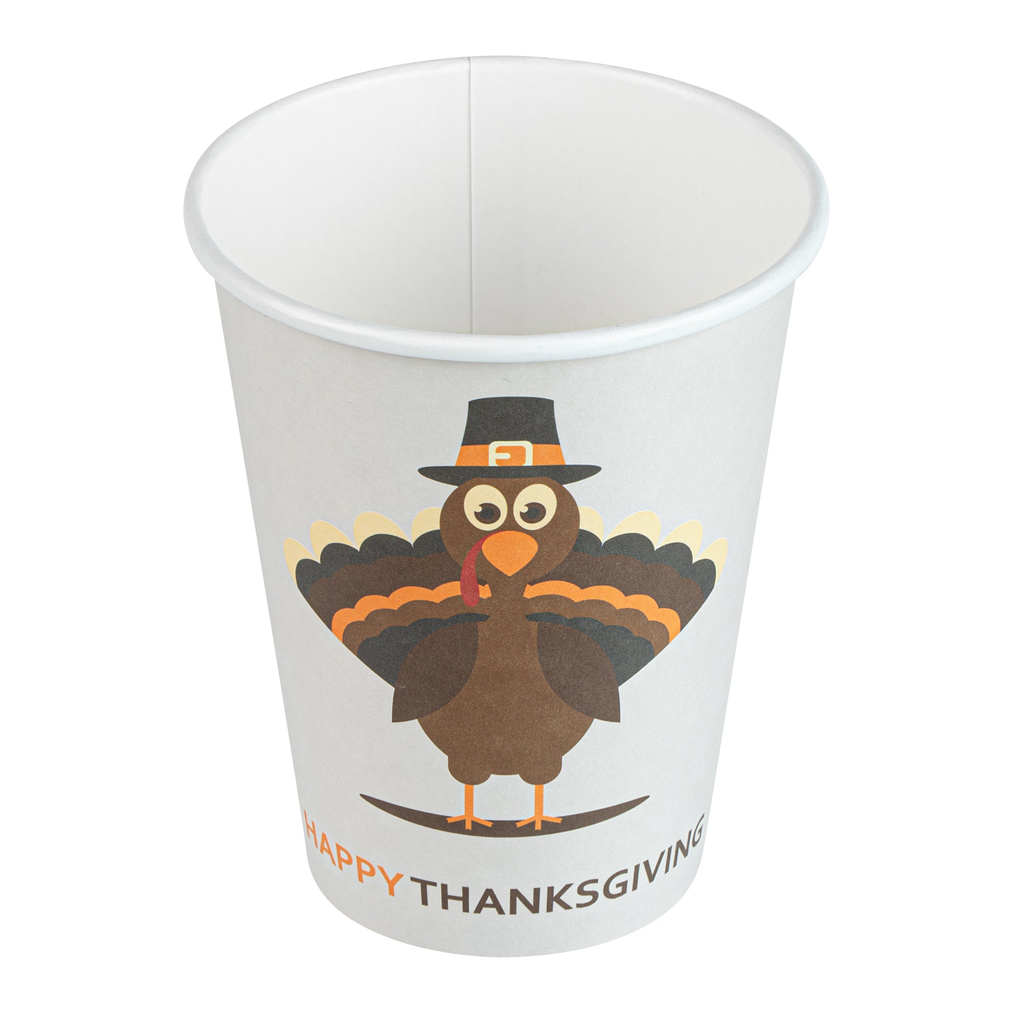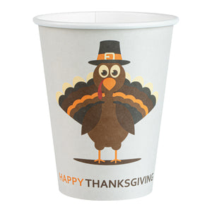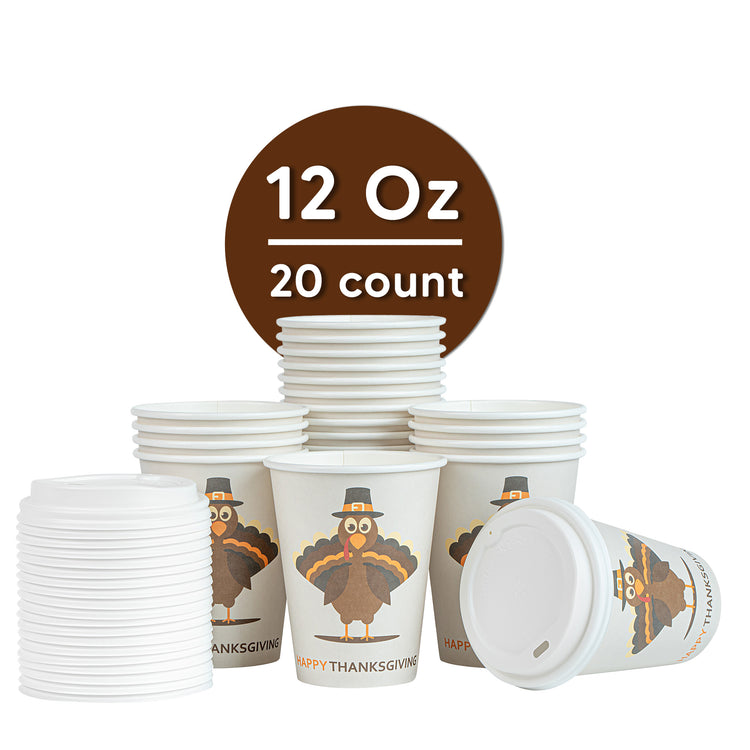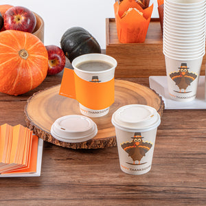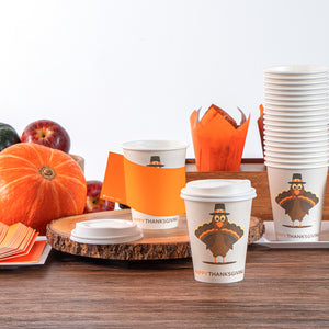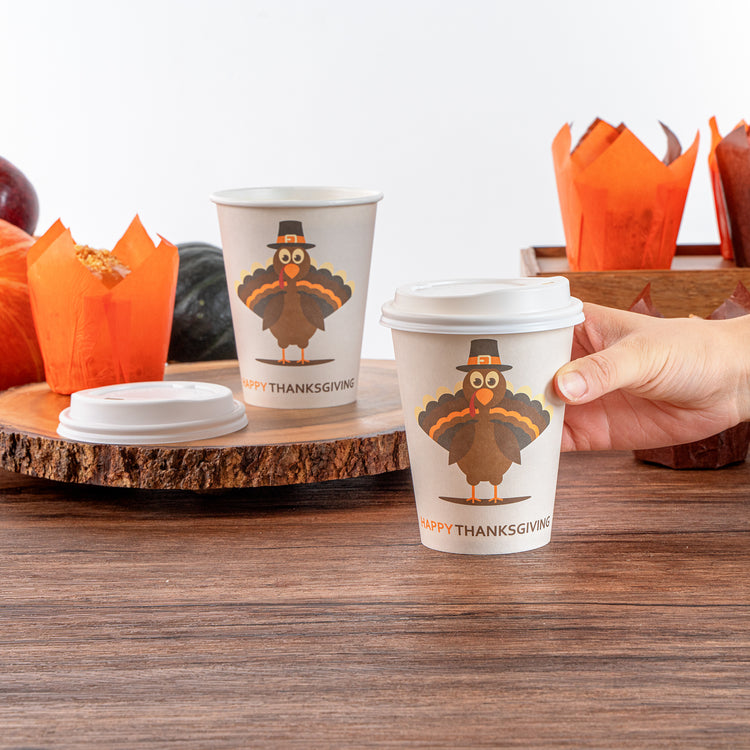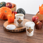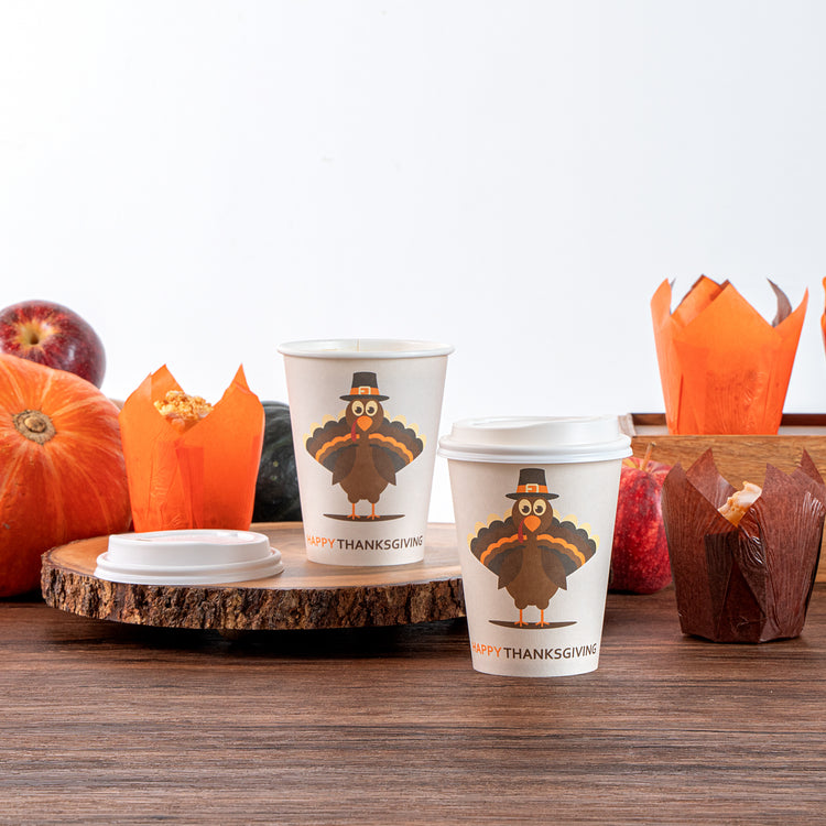 Celebrate the festive season with our Restpresso 12-ounce Happy Thanksgiving Paper Single Wall Coffee Cups. These disposable coffee cups come with white plastic lids that form a secure seal to prevent spills, ideal for an on-the-go sipping experience. Featuring an animated turkey wearing a pilgrim hat, these paper coffee cups bring a fun and festive touch to your Thanksgiving celebration, making each drink feel unique and seasonally themed. The greaseproof PE lining of these hot drink cups ensures a mess-free drinking experience, ideal for busy cafes and coffee shops. These 12-ounce coffee cups are crafted from premium paper and are durable, making them suitable for serving hot and cold drinks. The rolled rim design of these coffee cups with lids provides a smooth flow of beverages and an enhanced drinking experience. With leak-resistant seams, these hot cups with lids minimize the risk of potential leaks, keeping your customers' hands and clothes clean. Adorned with a “recycle me” message on the bottom, these disposable cups for coffee encourage guests to dispose of them in a planet-friendly way. These 12-ounce cups are disposable and can be discarded after use for an easy cleanup. Measuring 3.5 inches in diameter by 4.68 inches in height, these coffee cups have a capacity of 12 ounces. Sold in a 20 count box.