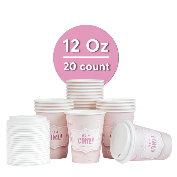 Celebrate the joyous arrival of a precious baby girl with our Restpresso 12-ounce It's a Girl Paper Single Wall Coffee Cups. Equipped with white plastic lids, these paper coffee cups form a secure seal and prevent spills, perfect for on-the-go sipping. Featuring a “Its A Girl” message with adorable designs, these coffee cups with lids are ideal for baby showers. These disposable coffee cups with lids feature a greaseproof PE liner, ensuring a mess-free drinking experience for your customers. The rolled rim of these hot cups with lids provides a smooth flow of beverage, enhancing the drinking experience. Crafted from premium paper, these disposable coffee cups are ideal for serving various hot and cold beverages. With leak-resistant seams, these disposable cups for coffee minimize the risk of potential leaks, making them reliable and convenient. Adorned with a "recycle me" message, these hot drink cups encourage guests to dispose of them in an eco-friendly manner. These 12-ounce coffee cups are disposable and facilitate an efficient post-drink cleaning experience. Measuring 3.5 inches in diameter by 4.68 inches in height, these paper tea cups have a capacity of 12 ounces making them ideal for any foodservice setting. Sold in a 20 count box.