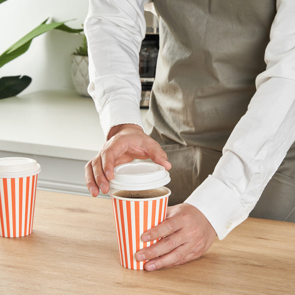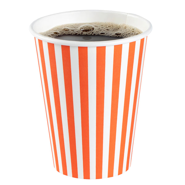 Immerse customers in a delightful coffee experience with our Restpresso 12-ounce Orange and White Stripe Paper Single Wall Coffee Cups. These paper coffee cups strike a perfect balance between functionality and style, featuring a captivating orange and white stripe design. Boasting a single-wall construction, these coffee cups offer the ideal solution for serving hot and cold beverages, ensuring optimal temperature maintenance. These cups for coffee come with a leakproof white lid, allowing you to carry your beverage comfortably. Designed with a greaseproof PE liner, these single-use coffee cups reduce leaks and spills, keeping your customers' hands clean and dry. The rolled rim of these disposable coffee cups provides a secure and comfortable sipping experience, enhancing your customers' overall satisfaction. Enhancing your coffee service efficiency, these recyclable hot tea cups are stackable, saving valuable counter space in your establishment. Match these coffee cups with our variety of sleeves for a comfortable coffee experience. Measuring 3.5 inches in diameter by 4.5 inches in height, these 12-ounce single wall coffee cups are perfectly sized for serving lattes, cappuccinos, and other popular coffee beverages. Sold in a 20 count box. Sleeves are available and sold separately.