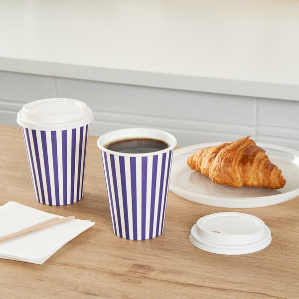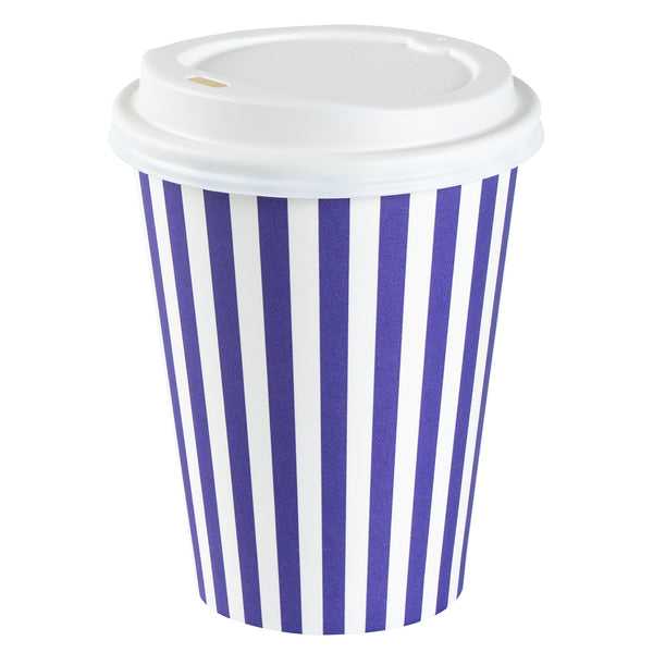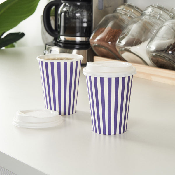 12 OZ PURPLE AND WHITE STRIPE PAPER SINGLE WALL COFFEE CUP - WHITE LID
