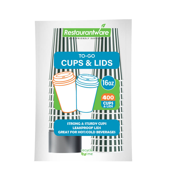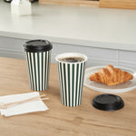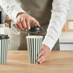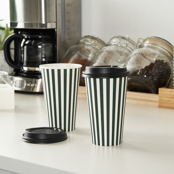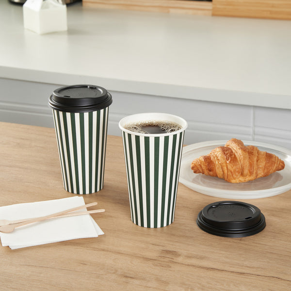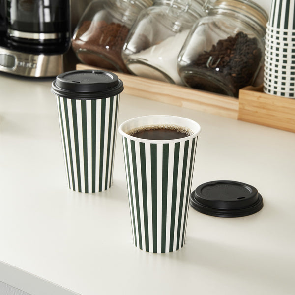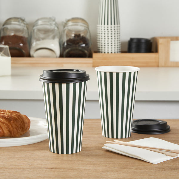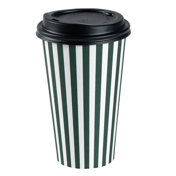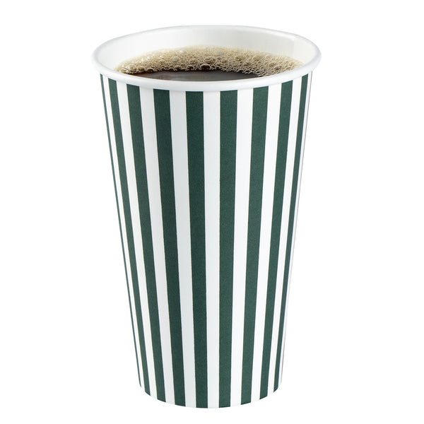 Experience the joy of serving hot or cold beverages in our Restpresso 16-ounce Forest Green and White Stripe Paper Single Wall Coffee Cups. Highlighting a tasteful forest green and white stripe pattern, these paper coffee cups are a stylish addition to your cafe or restaurant. The leakproof black lid of these coffee cups secures your on-the-go beverages. Crafted with a single wall design, these disposable hot cups are suitable for all kinds of foods. To create a leak-resistant seam, each disposable coffee cup features a rolled rim, ensuring your beverages are served without the mess. The greaseproof PE liner is included in these single use coffee cups, protecting against potential leaks and spills. With their stackable design, these single-use coffee cups offer space-saving benefits and easy storage. Combine these coffee cups with our assortment of cup sleeves aimed at providing better traction, thereby decreasing the potential for accidental spills or slips. Measuring 3.5 inches in diameter by 5.5 inches in height, these 16 ounce cups are perfect for serving medium-sized beverages. Sold in a 400 count box. Sleeves are available and sold separately.
