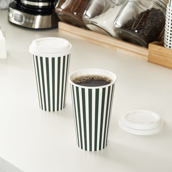 Elevate your beverage service with our Restpresso 16-ounce Forest Green and White Stripe Paper Single Wall Coffee Cups. These paper coffee cups are adorned with an eye-catching forest green and white stripe design, bringing a pop of color and style to your offerings. With their greaseproof feature and PE liner, these disposable hot cups reduce messes, making them perfect for on-the-go customers. Ideal for both hot and cold beverages, these single wall coffee cups offer versatility and convenience for your customers. These coffee cups forest green and white striped finish adds a unique touch to your presentation, ensuring your beverage service stands out. Space-saving and efficient, these stackable cups are a great choice for establishments with limited storage areas. The rolled rim of these single-use coffee cups ensures a snug fit with the included white lid, minimizing leaks and spills during transport. With a leak-resistant seam, these cups provide a reliable solution for your coffee service. These green and white coffee cups boast a capacity of 16 ounces, perfect for serving medium-sized beverages. Pair these elegant coffee cups with our diverse selection of sleeves for a sophisticated and burn-free coffee experience. Measuring 3.5 inches in diameter by 5.75 inches in height, these recyclable hot tea cups are a compact and practical choice for your establishment. Sold in a 400 count box. Sleeves are available and sold separately.