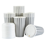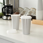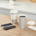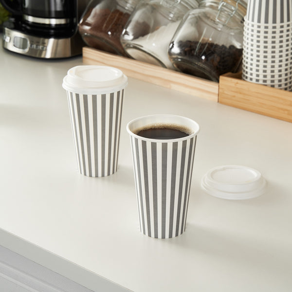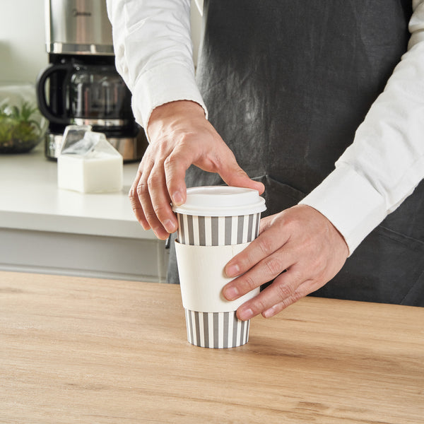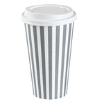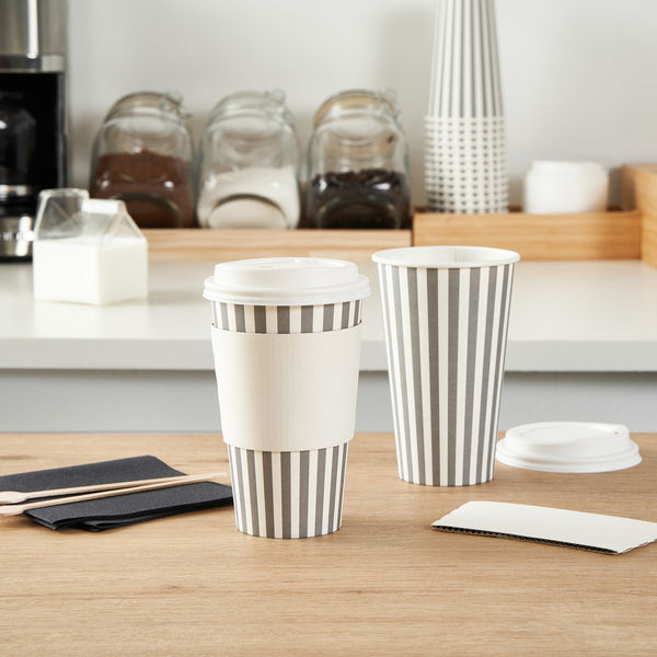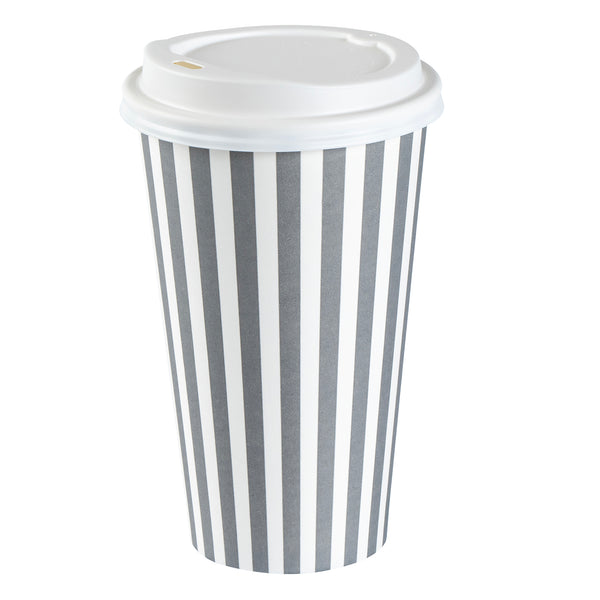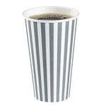 Serve your customers their morning pick-me-up in our Restpresso 16-ounce Gray and White Stripe Paper Single Wall Coffee Cups. With a chic gray and white striped finish, these single-use coffee cups add a touch of elegance to your beverage service. These paper coffee cups come equipped with a white lid, ensuring your customers' drinks stay securely inside during their commute. Made to withstand both high and low temperatures, these disposable hot cups are perfect for serving everything from hot coffee to iced tea. The PE liner inside makes these coffee cups greaseproof, reducing any unwanted leaks or spills. With a rolled rim and leak-resistant seam, these single wall coffee cups provide your customers with a comfortable, reliable drinking experience. Easy to stack and store, these paper coffee cups are a space-saving solution for your restaurant or cafe. Coordinate these coffee cups with our lineup of sleeves, offering a blend of fashion and functionality With a generous capacity of 16 ounces, these disposable coffee cups are ideal for serving large beverages. Measuring 3.5 inches in diameter by 5.75 inches in height, these recyclable hot tea cups fit perfectly into most coffee machines and car cup holders. Sold in a 400 count box. Sleeves are available and sold separately.