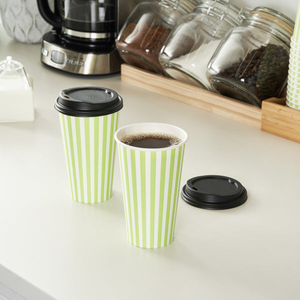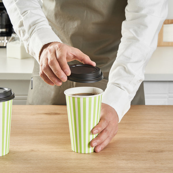 Experience the perfect blend of functionality and style with our Restpresso 16-ounce Green and White Stripe Paper Single Wall Coffee Cups. These single-use coffee cups are designed with a greaseproof PE liner, providing an ideal solution for serving both hot and cold beverages. With a unique green and white striped finish, these paper coffee cups add a dash of elegance to your drink presentations. The single wall of these disposable hot cups offers excellent insulation, ensuring your beverages stay at their optimal temperature for longer. Included with a black lid, these coffee cups are perfect for takeaway services, enhancing customer convenience while reducing spillages. To further enhance their functionality, these stackable coffee cups are designed with a rolled rim and leak-resistant seam, providing a secure and comfortable drinking experience for your customers. Connect these coffee cups with our array of cup sleeves intended to maximize grip, minimizing the risk of accidental spills or slips. Boasting a generous capacity of 16 ounces, these recyclable hot tea cups are ideal for serving a variety of beverages. With dimensions measuring 3.5 inches in diameter by 5.5 inches in height, these disposable striped coffee cups are perfectly sized for most standard drink sizes. Sold in a 20 count box. Sleeves are available and sold separately.