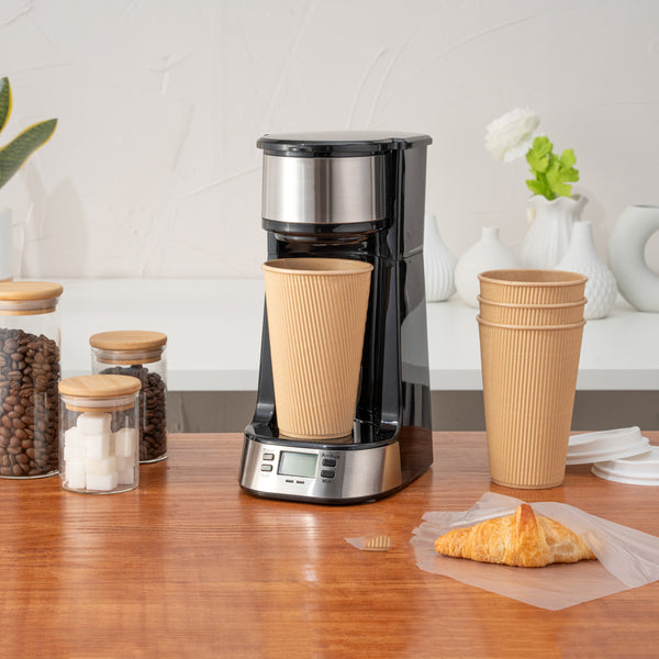 Enhance takeaway services with insulated hot drink cups. Restpresso 16 oz Non-Slip Grip Paper Coffee Cups With Lids feature a unique Kraft Ripple Wall design that insulates hot beverages, maintaining their warmth while keeping hands cool. These 16 oz paper coffee cups with lids are essential for coffee shops aiming to provide a spill-free experience, as the included lids create a tight-fitting seal to keep coffee hotter for longer. Made from kraft paper, these kraft ripple wall cups with lids offer a rustic look that appeals to patrons. The built-in insulation, combined with a greaseproof lining protects against leaks and spills, ensuring a mess-free and enjoyable beverage experience. Perfect for high-traffic settings, these cups simplify cleanup, enhancing operational efficiency. Each order includes 200 Restpresso 16 oz Non-Slip Grip Paper Coffee Cups With Lids.