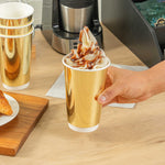 Impress guests with our Restpresso 16-ounce Metallic Gold Paper Hot / Cold Cups. Their shimmering gold finish enhances the look of any beverage table while offering flexibility for both hot and cold drinks. From steaming chai lattes to chilled mocktails, these cups do it all with elegance. Made from thick paper, they’re strong enough for extended use without losing shape. Thanks to their freezer-safe build, they’re perfect for prepping frozen treats or beverages ahead of service. A sophisticated solution for parties, venues, and events of all sizes. Each cup measures 2.36 inches in diameter by 5.32 inches in height and holds up to 16 ounces. Sold in a 500 count box.