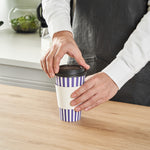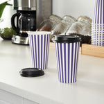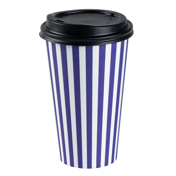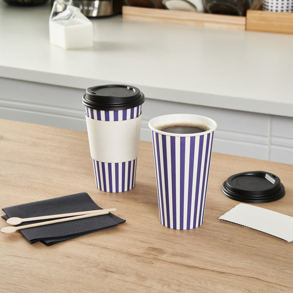 Serve your delicious beverages in style with our Restpresso 16-ounce Purple and White Stripe Paper Single Wall Coffee Cups. These paper coffee cups feature a vibrant purple and white striped finish, adding a touch of sophistication to your establishment's disposable hot cup offerings. Designed with a greaseproof PE liner, these single-use coffee cups are perfect for serving hot and cold drinks, ensuring versatility for your cafe, restaurant, or catering business. These single wall coffee cups come with black lids, providing a secure and leak-resistant seal for your customers' convenience. Stackable and easy to store, these disposable coffee cups are perfect for businesses with limited storage space. Boasting a rolled rim and leak-resistant seam, these single use coffee cups are designed for a comfortable drinking experience. Pair these coffee cups with our collection of cup sleeves crafted to offer improved traction, reducing the likelihood of accidental spills or slips. With a generous 16-ounce capacity and measuring 3.5 inches in diameter by 5.5 inches in height, these recyclable hot tea cups are ideal for satisfying the thirst of your customers on the go. Sold in a 20 count box. Sleeves are available and sold separately.