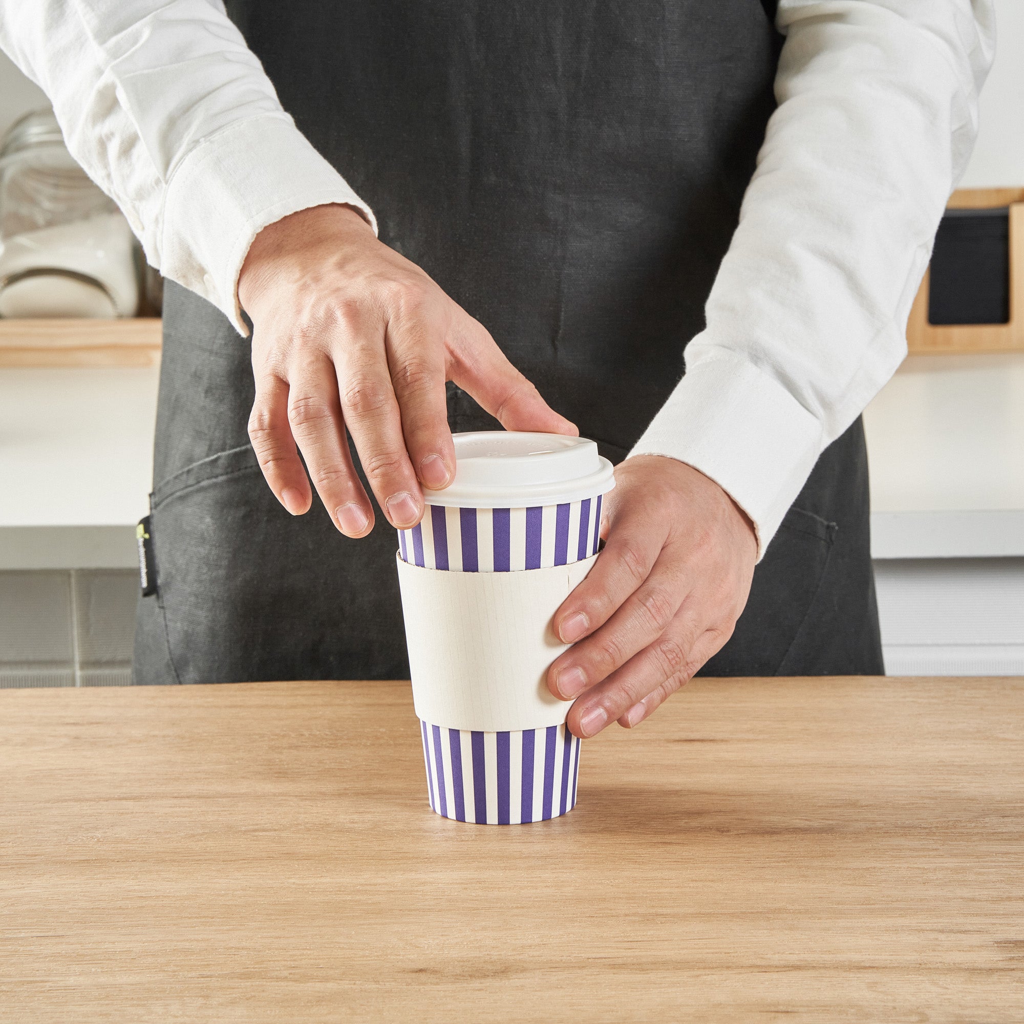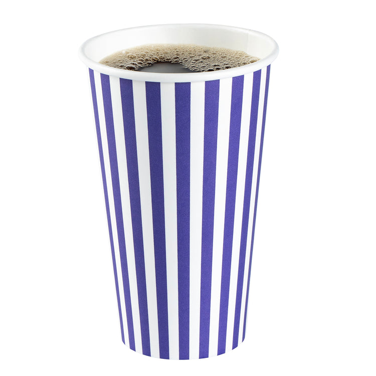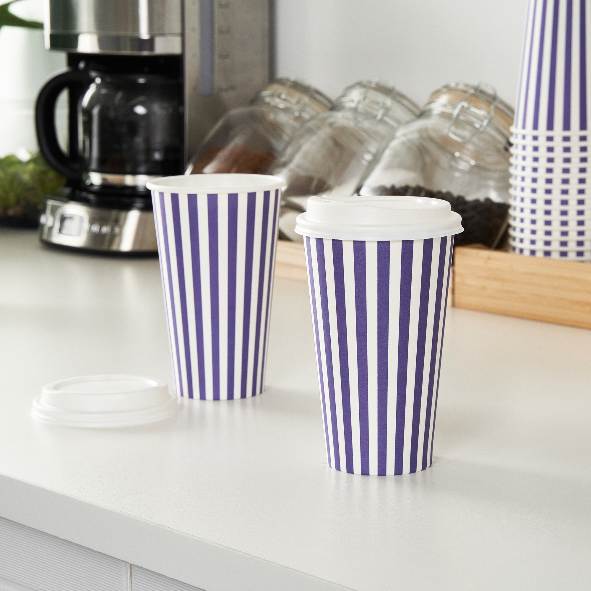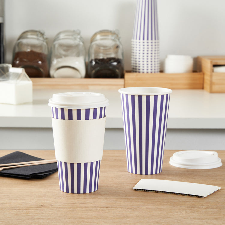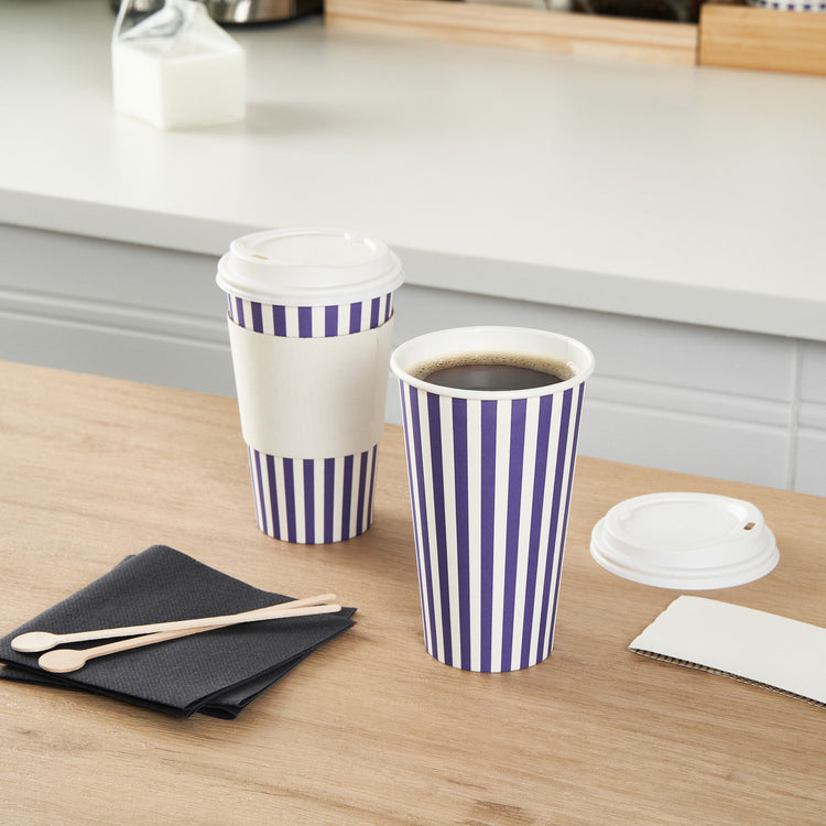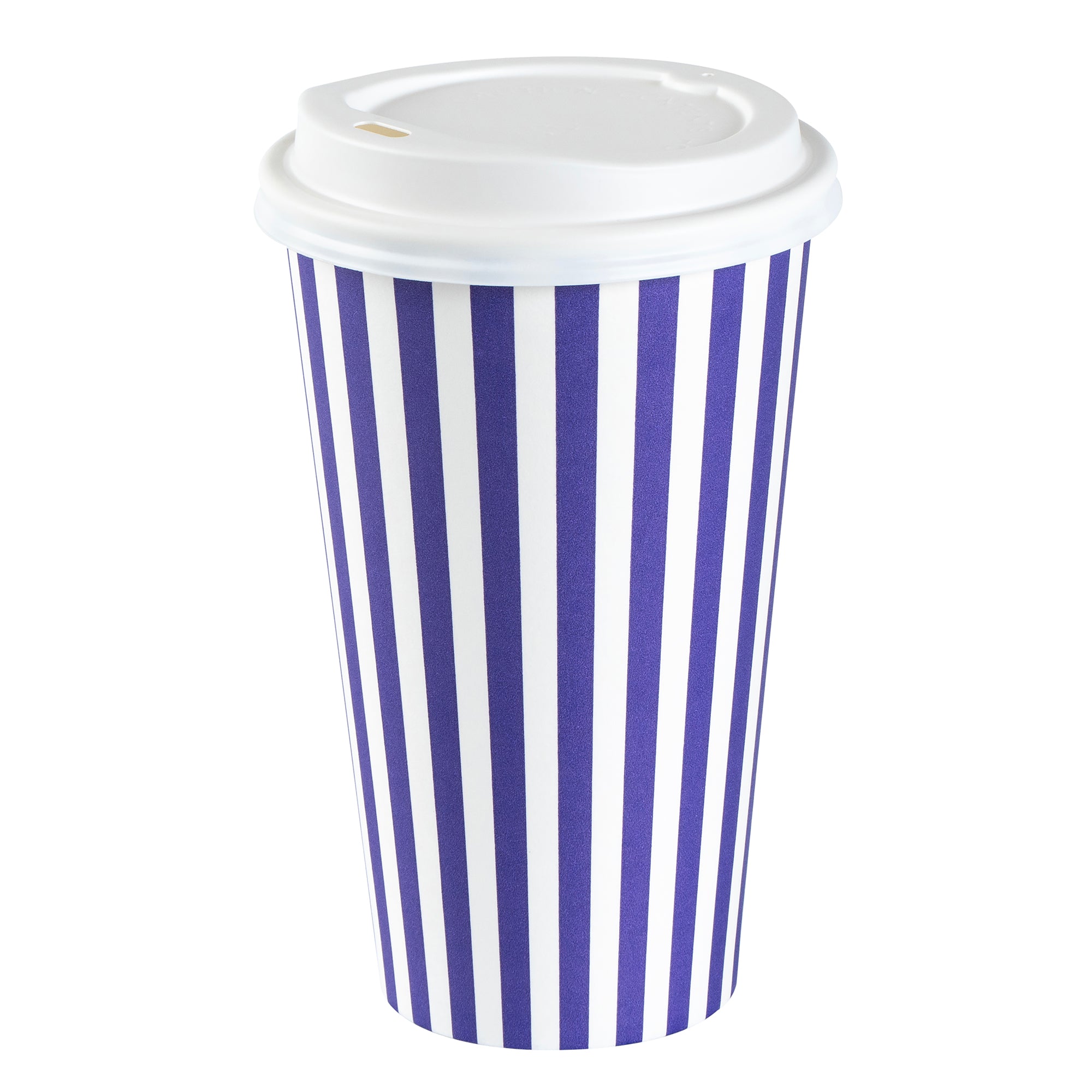 Sip your favorite beverages using our Restpresso 16-ounce Purple and White Stripe Paper Single Wall Coffee Cups. These single-use coffee cups are easy to handle, ensuring a comfortable grip while enjoying your hot or cold drinks. Boasting an attractive purple and white striped finish, these coffee cups are sure to enhance your brand image and impress your customers. Made with a greaseproof PE liner, these disposable hot cups reduce leaks and maintain the integrity of your beverages. These paper coffee cups are designed with a rolled rim and leak-resistant seam, providing a secure, comfortable drinking experience. Plus, these single wall coffee cups come with a leakproof white lid, making them ideal for taking beverages on the go. With a capacity of 16 ounces, these disposable coffee cups are perfect for serving larger drinks. Pair up these deluxe coffee cups with our versatile sleeve collection for a touch of sophistication and comfort. Measuring 3.5 inches in diameter by 5.75 inches in height, these recyclable hot tea cups are a compact and efficient choice for your foodservice establishment. Sold in a 400 count box. Sleeves are available and sold separately.