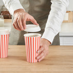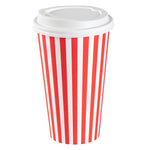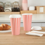 Ensure your coffee service is spill-free with leakproof convenience. The Restpresso Leakproof Disposable Coffee Cup with its included leakproof lids keeps your customer's coffee secure, preventing potential spills or leaks during transit. Crafted from paper with a PE liner, this 16-ounce disposable coffee cup features a greaseproof lining that maintains the integrity of the cup, ensuring it does not become soggy even with hot beverages. Its red and white striped design adds a festive touch, enhancing beverage presentations and delighting customers at coffee shops and cafes. Measuring 3.5 inches in diameter and 5.75 inches in height, this cup easily fits most standard cup holders, making it a practical choice for takeaway coffee services. Elevate your hot beverage offerings with this hot coffee cup with lid and provide a reliable, mess-free experience your customers will appreciate. Each order includes 20 Restpresso Leakproof Disposable Coffee Cups.