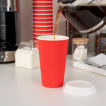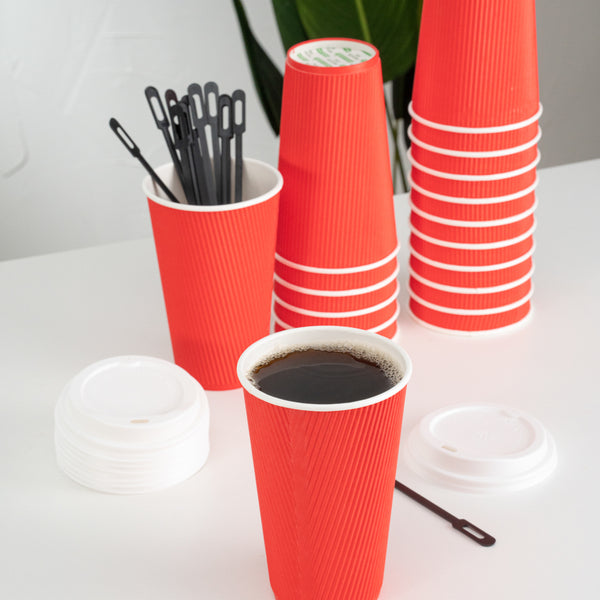 Enhance your beverage service with style and functionality. Restpresso 16 oz Disposable Coffee Cups With Lids feature a striking Red Ripple Wall design that expertly retains heat for hot beverages, ensuring a warm drink while keeping hands comfortably cool. The included white lids provide a tight-fitting seal, making these disposable coffee cups with lids perfect for preventing spills and maintaining beverage temperature during transit. Constructed from durable paper, these cups offer a sturdy option for serving hot beverages without the need for double cupping. Order now to keep your café or event well-stocked and ready for high-volume demands. Each order includes 200 Restpresso 16 oz Disposable Coffee Cups with Lids.
