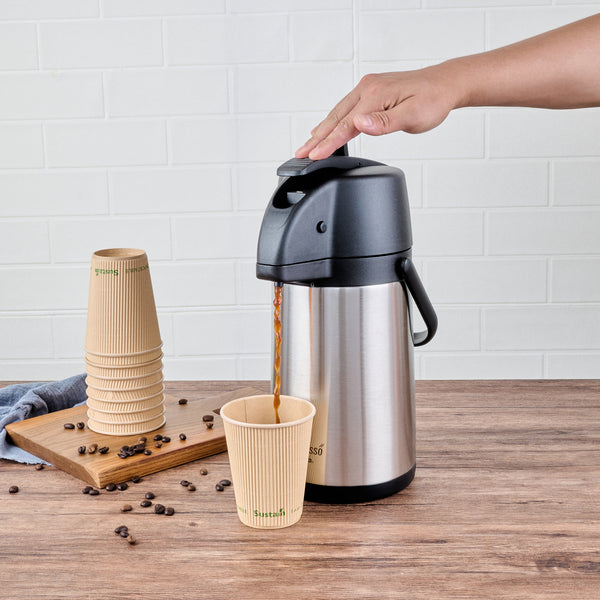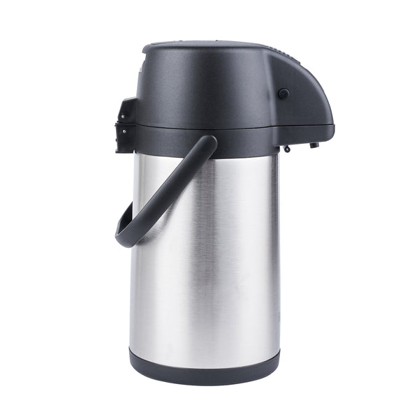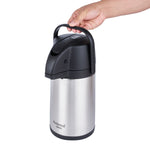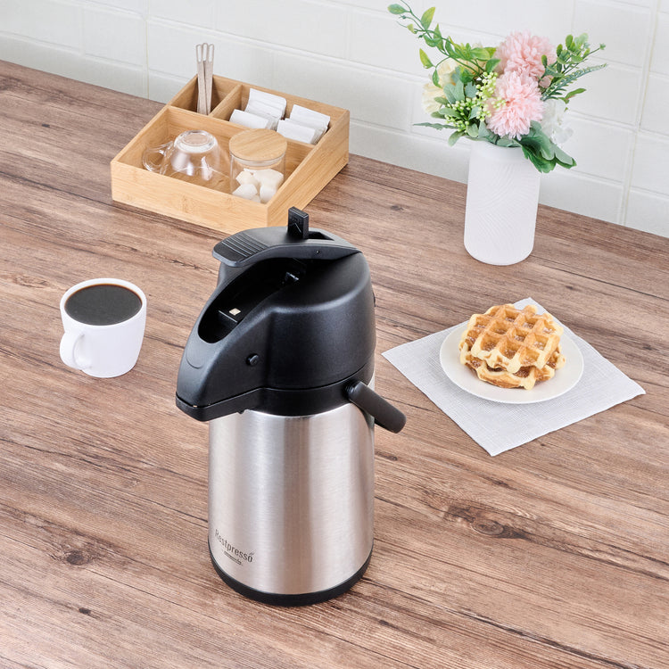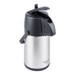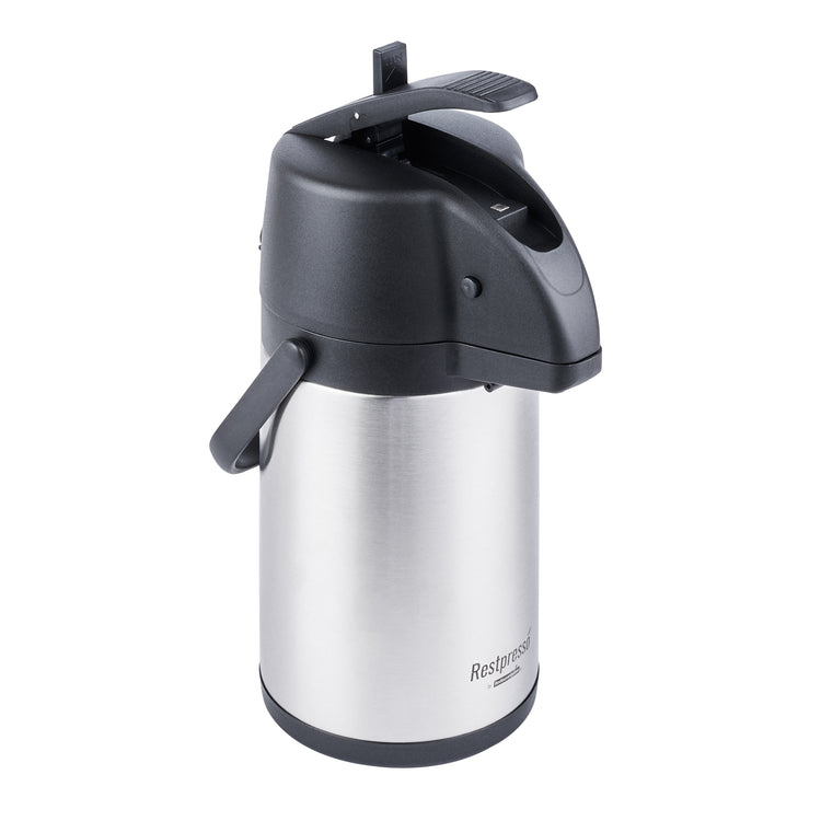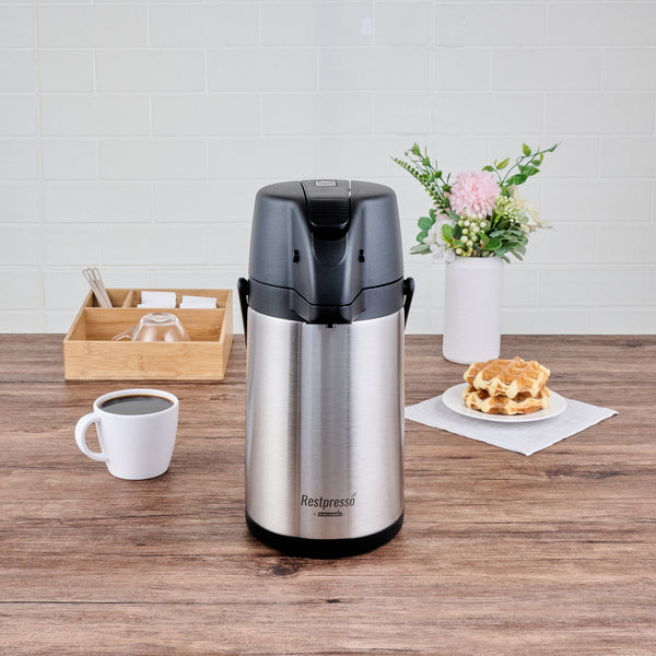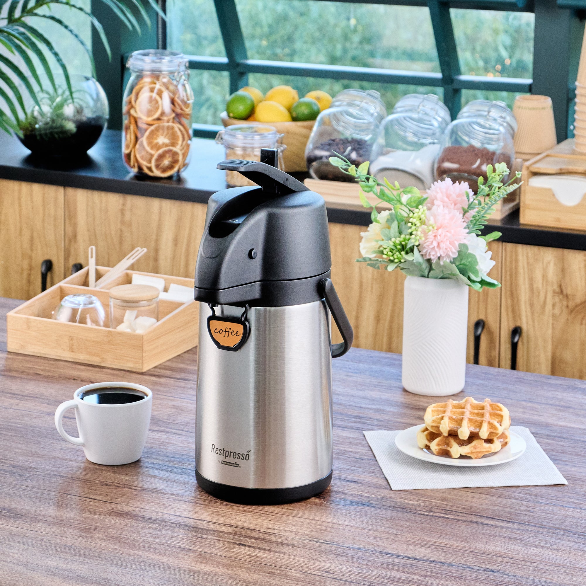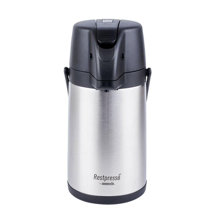Ensure every cup is served at the perfect temperature with the Restpresso Vacuum Insulation Airpot Coffee Dispenser. This airpot coffee dispenser's double wall vacuum insulation keeps beverages hot for up to 12 hours, making it ideal for catering events and busy hotel breakfast buffets. Its BPA-free design ensures a safe and reliable solution for serving coffee at any occasion, enhancing your guests' experience with peace of mind. The included hanging tags and decals simplify drink identification, allowing staff to efficiently manage beverage service in bustling environments. Measuring 14.2 inches in length, this thermal coffee dispenser is constructed from stainless steel, providing durability and a sleek appearance that complements any setting. With its pump lever mechanism, it guarantees easy and efficient dispensing, reducing wait times and improving service flow. Elevate your coffee service and maintain customer satisfaction with this dependable vacuum airpot. Each order includes 1 Restpresso Vacuum Insulation Airpot Coffee Dispenser.