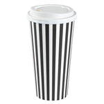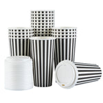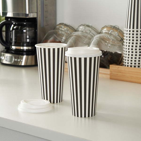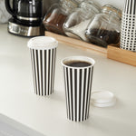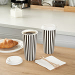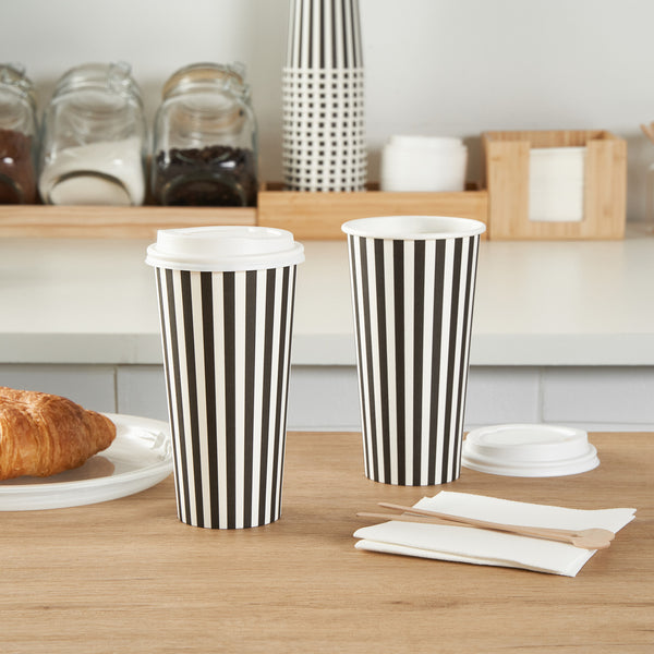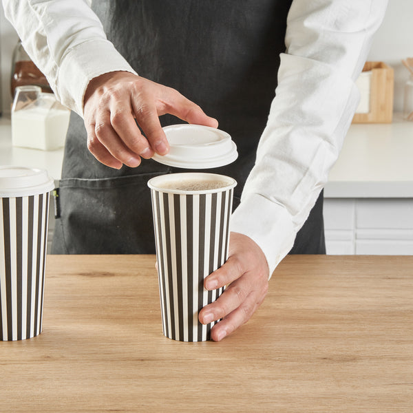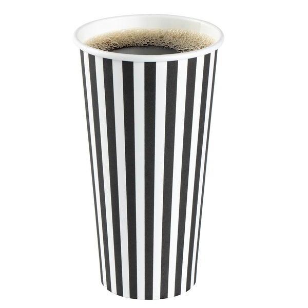 Serve your delicious brews in our Restpresso 20-ounce Black and White Stripe Paper Single Wall Coffee Cups. These paper coffee cups, with their unique black and white stripe design, offer a chic alternative to plain, single-use coffee cups. Crafted with a greaseproof PE liner, these disposable hot cups ensure a leak-free experience, letting your customers enjoy their drink without any mess. These single wall coffee cups come with a leakproof white lid and are perfect for holding hot and cold beverages. Featuring a rolled rim, these disposable coffee cups provide a comfortable drinking experience, enhancing customer satisfaction. Stackable for efficient storage, these single-use coffee cups are ideal for bustling coffee shops or busy catering events. With a generous capacity of 20 ounces, these recyclable hot tea cups are perfect for serving large, invigorating coffee brews. Pair up these vintage coffee cups with our sleeve collection, adding a nostalgic touch to your coffee enjoyment. Measuring 3.5 inches in diameter by 6.5 inches in height, these striped coffee cups are compact and easy to handle. Sold in a 400 count box. Sleeves are available and sold separately.