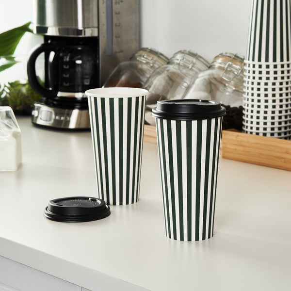 Experience the perfect blend of style and functionality with our Restpresso 20-ounce Forest Green and White Stripe Paper Single Wall Coffee Cups. Designed to hold all kinds of beverages, these disposable hot cups feature a single wall construction that's perfect for hot and cold drinks. With a striking forest green and white striped finish, these coffee cups instantly elevate the presentation of your drinks. Crafted with a greaseproof PE liner, these disposable coffee cups ensure a leak-resistant seam for comfortable sipping. The black lid that comes with these single-use coffee cups offers a secure fit, reducing spills and messes during transport. These single wall coffee cups are stackable and save valuable storage space in your establishment. Pair these coffee cups with our array of cup sleeves designed to maximize traction, reducing the likelihood of accidental spills or slips. Boasting a generous 20-ounce capacity, these recyclable hot tea cups are perfect for serving large coffee drinks or other hot beverages. Measuring 3.5 inches in diameter by 6.5 inches in height, these striped coffee cups provide a comfortable grip for your customers. Sold in a 400 count box. Sleeves are available and sold separately.