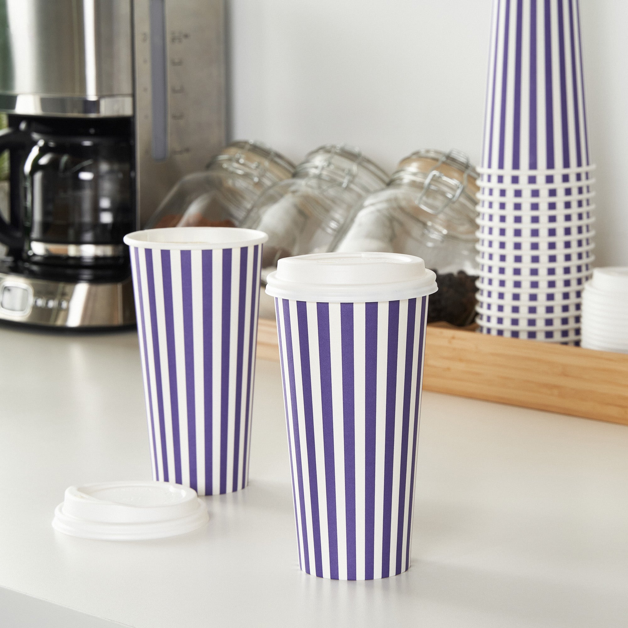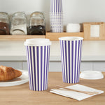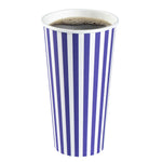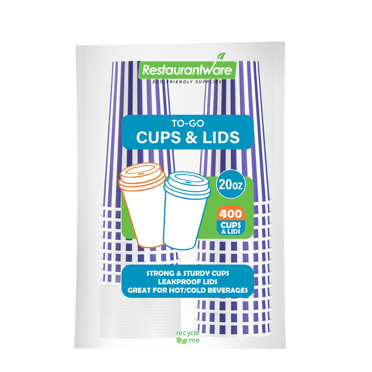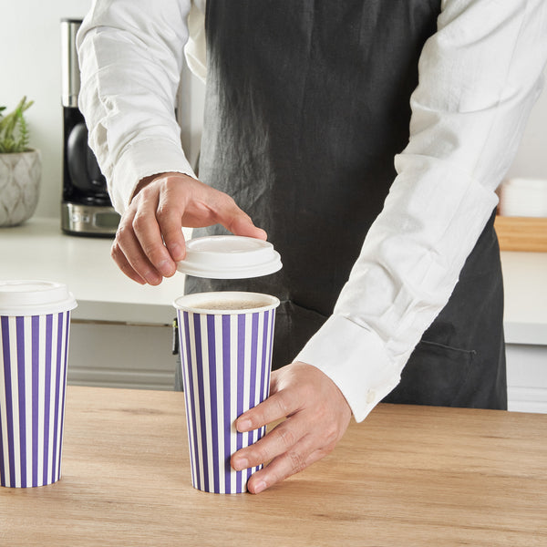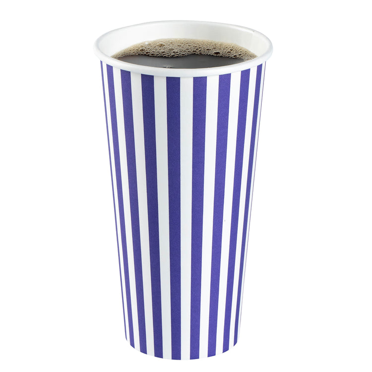 Begin your day with our Restpresso 20-ounce Purple and White Stripe Paper Single Wall Coffee Cups. Crafted with a greaseproof PE liner, these paper coffee cups reduce unwanted leaks and spills, ensuring a clean and convenient drinking experience. These disposable hot cups are expertly designed to hold hot and cold beverages, making them a versatile choice for any refreshment. Celebrate the uniqueness of these single wall coffee cups, featuring a vibrant purple and white stripe finish that adds a pop of color to your morning routine. These disposable coffee cups come with a white lid for sipping on the go. The stackable design of these recyclable hot tea cups saves valuable storage space in your establishment. Enjoy the secure and comfortable grip provided by the rolled rim of these beverage cups, enhancing your customers' drinking experience. The leak-resistant seam of these drinking cups is designed to ensure that your beverage remains inside your cup, not on your clothes. Coordinate these elegant coffee cups with our assortment of sleeves, ensuring a sophisticated and burn-free coffee session. With a generous capacity of 20 ounces, these hot cups are perfect for that large morning coffee or tea. Measuring 3.5 inches in diameter by 6.5 inches in height, these striped coffee cups the ideal size for your daily caffeine fix. Sold in a 400 count box. Sleeves are available and sold separately.