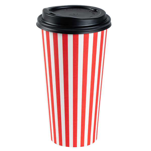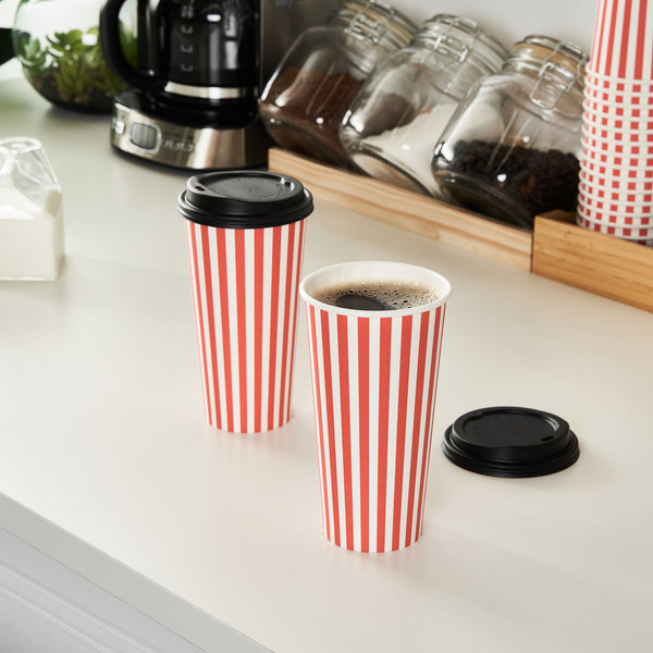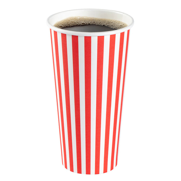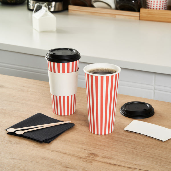 Serve your beverages in style with our Restpresso 20-ounce Red and White Stripe Paper Single Wall Coffee Cups. These paper coffee cups are greaseproof and feature a PE liner, ensuring your customers' beverages stay inside the cup without leakage. Ideal for hot or cold drinks, these disposable hot cups are single wall, providing a comfortable grip without the need for a sleeve. Sporting a charming red and white striped finish, these recyclable hot tea cups are perfect for coffee shops, cafes, or any establishment looking to add a touch of whimsy to their drinkware. The black lid and stackable design make these coffee cups convenient for on-the-go customers, while the rolled rim and leak-resistant seam ensure a secure fit and a pleasant drinking experience. Combine these coffee cups with our tailored cup sleeves crafted to intensify grip, ensuring fewer instances of accidental spills or slips. With a generous 20-ounce capacity, these striped coffee cups are perfect for satisfying your customers' thirst, and they measure 3.5 inches in diameter by 6.5 inches in height. Sold in a 400 count box. Sleeves are available and sold separately.