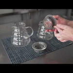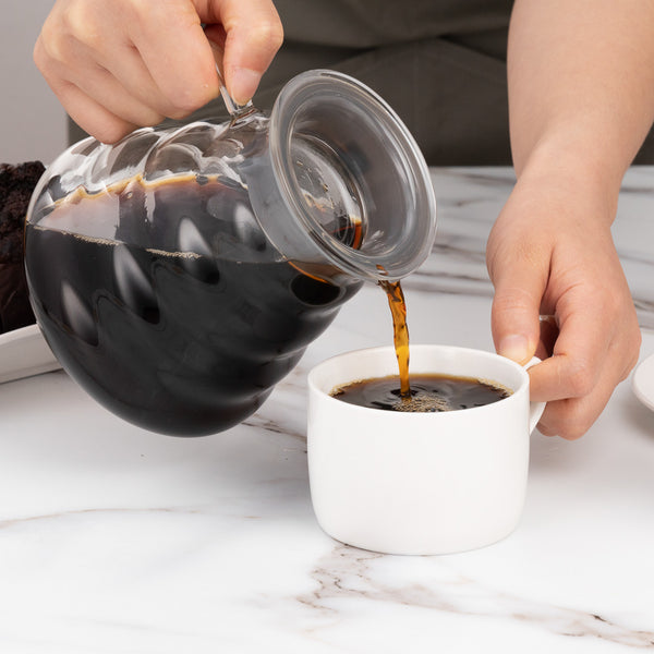 Easily serve customers at your diner or restaurant a cup of coffee using our Restpresso 25-ounce Round Clear Glass Range Coffee Server/Carafe. Constructed from high-quality glass, this heat-resistant coffee pot server helps preserve the temperature of hot and cold drinks to ensure that customers' beverages are fresh. With a built-in handle, this glass carafe provides your employees with a comfortable way to pour hot tea into cups without burning their hands. This glass carafe includes a silicone cover that locks in beverages to eliminate accidents while serving guests. Plus, this coffee server cover has a brown finish which allows your staff to quickly distinguish regular coffee from decaf. This clear coffee server allows you to quickly identify when the server needs to be refilled without opening it. Each large coffee server has a wide spout that provides customers an efficient way to serve themselves coffee at your self-serve coffee station. Containing up to 25 ounces, this coffee server measures 3.25 inches in diameter by 4.75 inches in height. Shipped in a 1 count box.