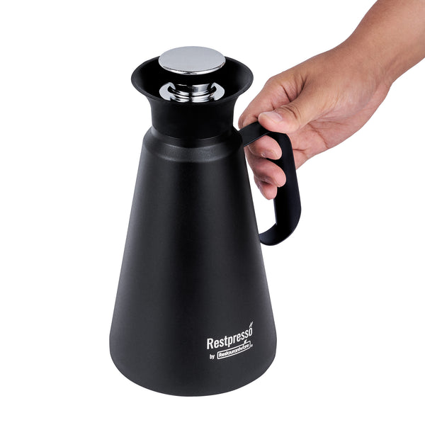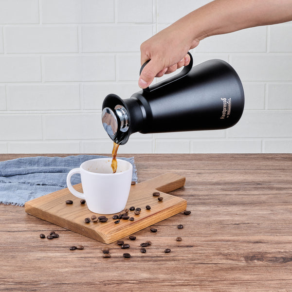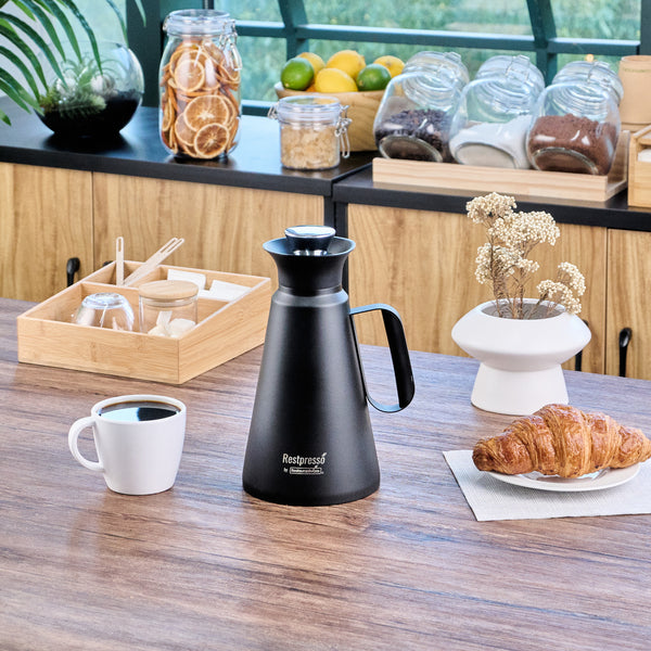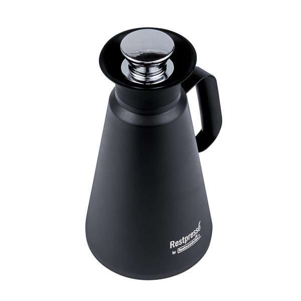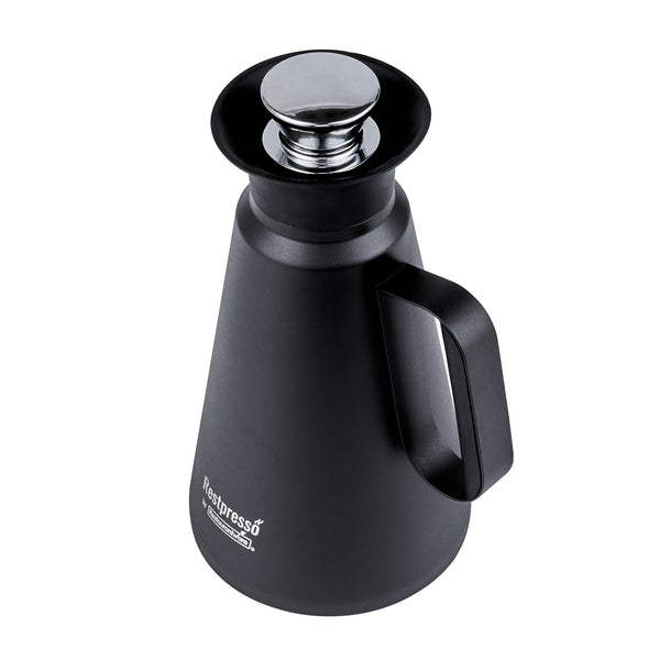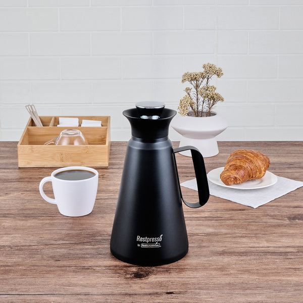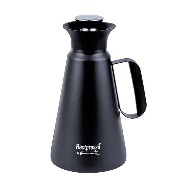 Maintain beverage temperatures with our Restpresso Vacuum Insulated Coffee / Tea Server. This stainless steel coffee pot features vacuum insulation to keep your drinks hot or cold for extended periods, reducing waste and ensuring optimal serving conditions. The 360-degree pour spout allows seamless water flow from any angle, providing easy and efficient serving, making it a reliable vacuum insulated pot for busy cafes and coffee shops. With a durable 34-ounce capacity, this tea server is perfect for catering events or conference centers, reducing the need for frequent refills while maintaining professional aesthetics. Crafted from premium stainless steel, this coffee server ensures longevity in high-volume environments. Its sleek black design enhances any beverage service setup, adding a modern touch to your presentation. Upgrade your beverage service with this versatile tea server. Each order includes 1 Restpresso Vacuum Insulated Coffee / Tea Server.