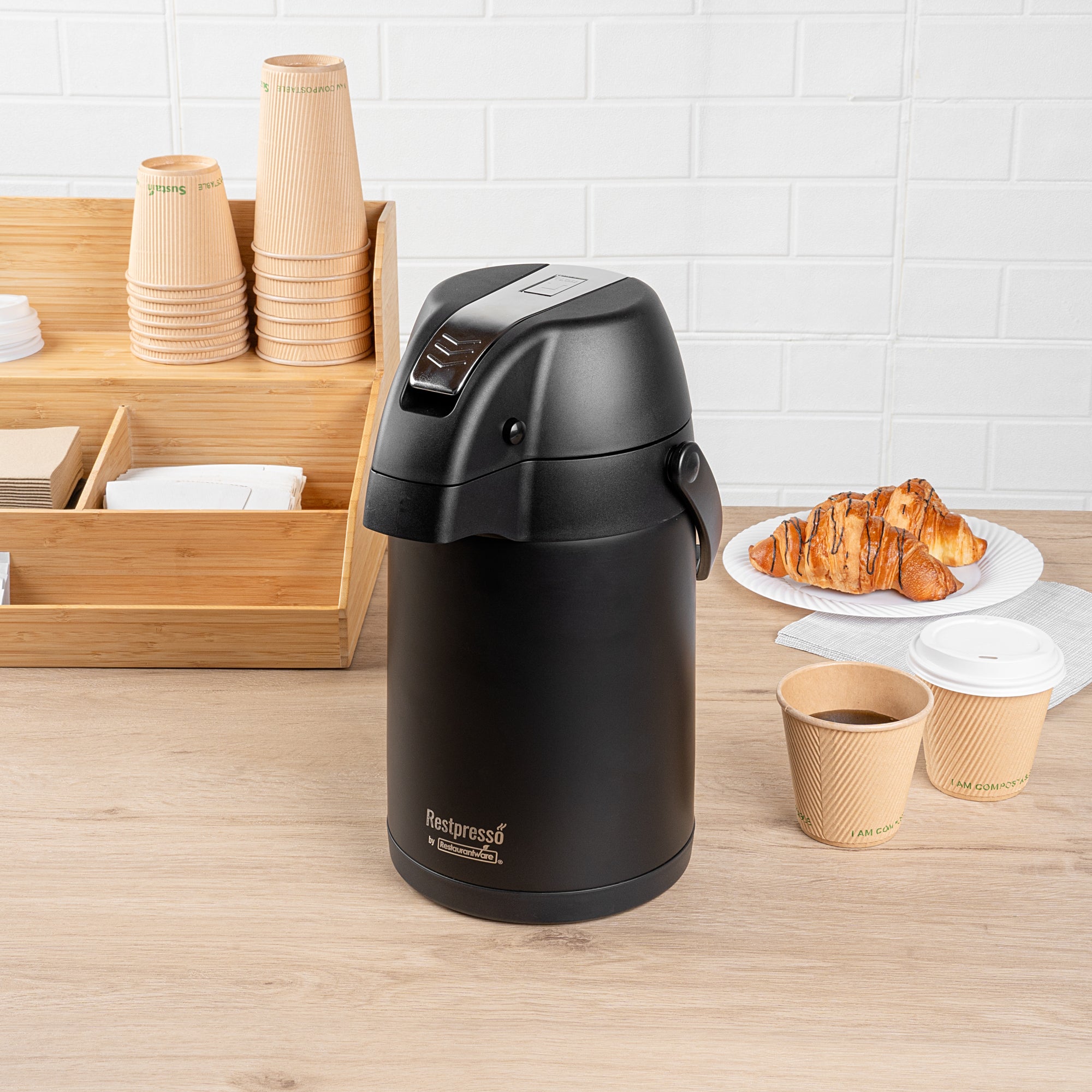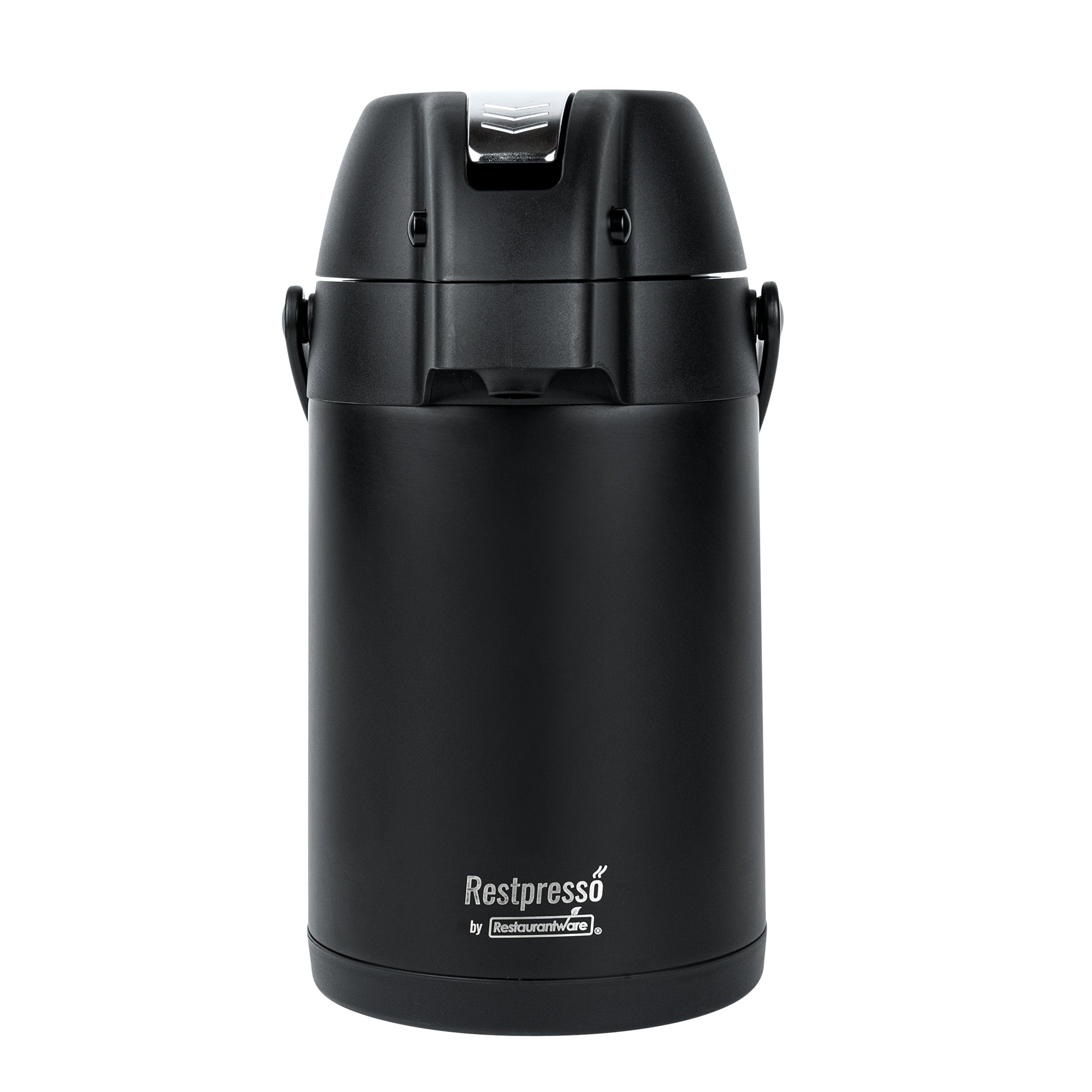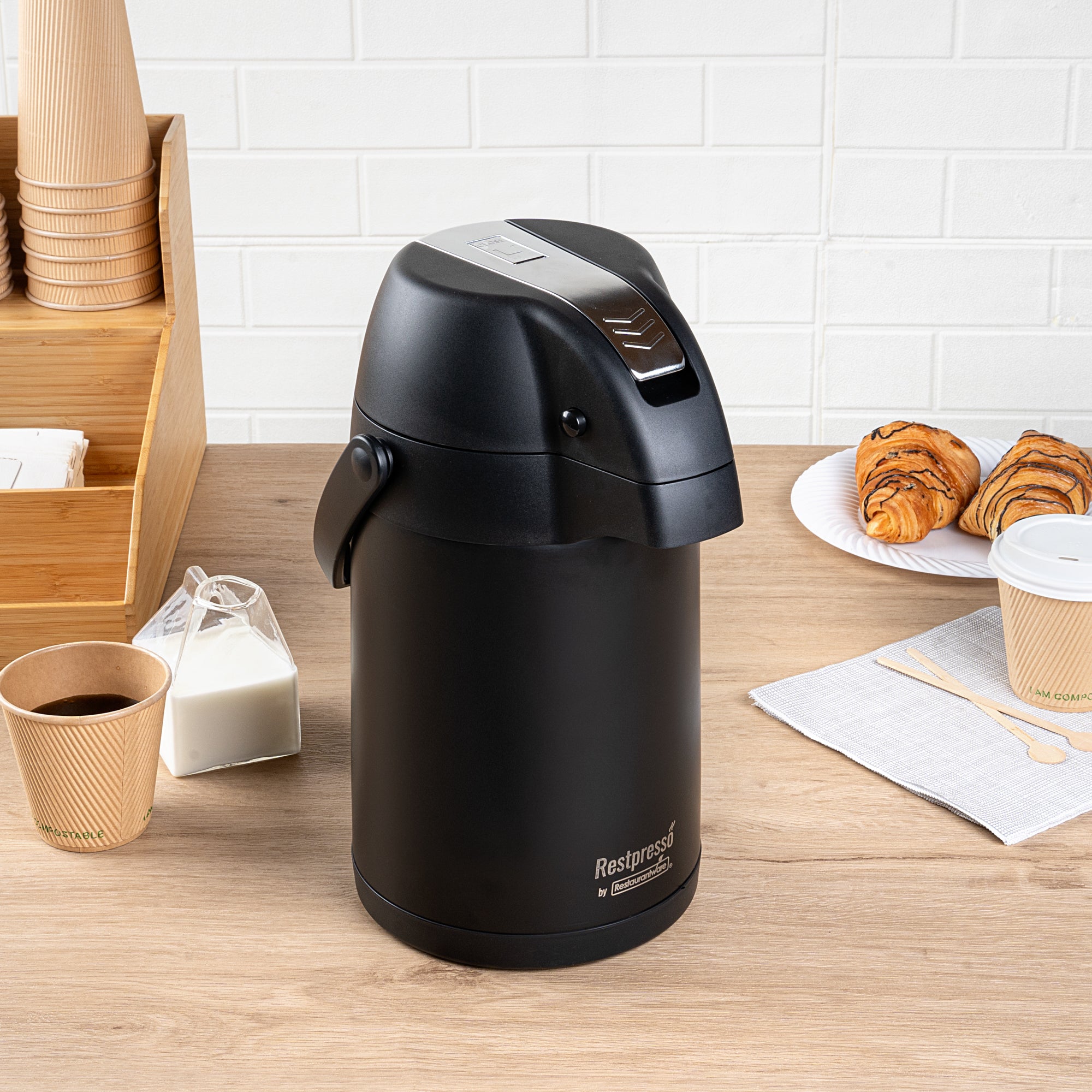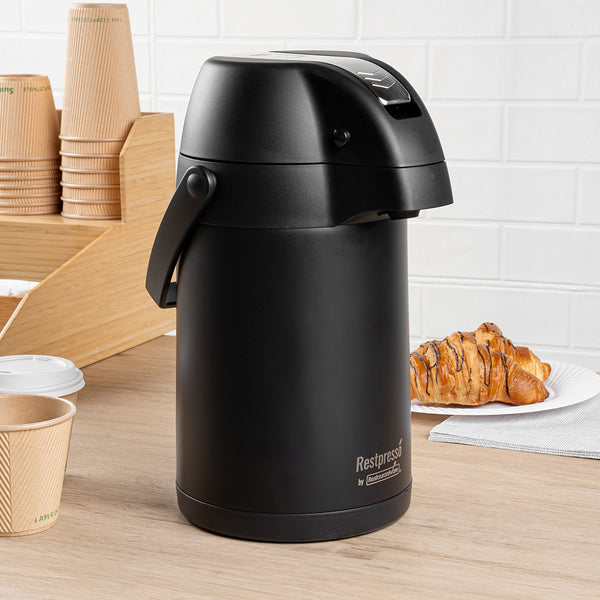 Ensure optimal beverage service with our vacuum insulated airpot. The Restpresso Vacuum Insulation Thermal Coffee Carafe combines advanced vacuum insulation technology with a sleek black exterior, maintaining hot coffee temperatures for up to 12 hours to enhance hospitality experiences. With its substantial 3-liter capacity, this thermal coffee carafe minimizes the need for frequent refills, making it perfect for high-traffic events or bustling breakfast buffets. Its user-friendly pump mechanism ensures spill-free dispensing, boosting efficiency in fast-paced environments, while the premium stainless steel construction guarantees durability, even with heavy use. The convenient swivel base allows 360-degree rotation, providing easy access from any angle and enhancing user experience in self-serve stations. Elevate your beverage service with this insulated beverage dispenser, designed to keep your coffee station running smoothly. Each order includes 1 Restpresso Vacuum Insulation Thermal Coffee Carafe.