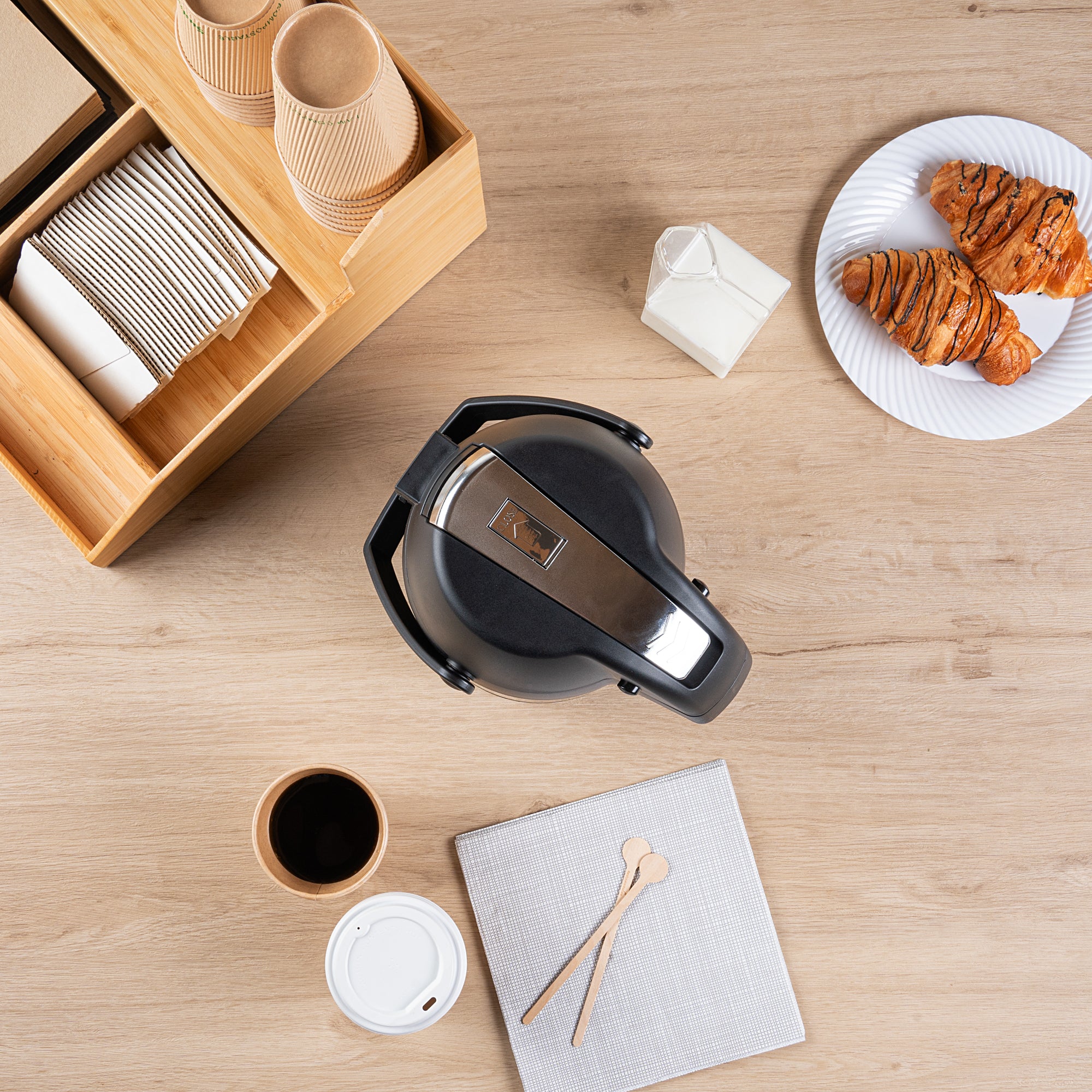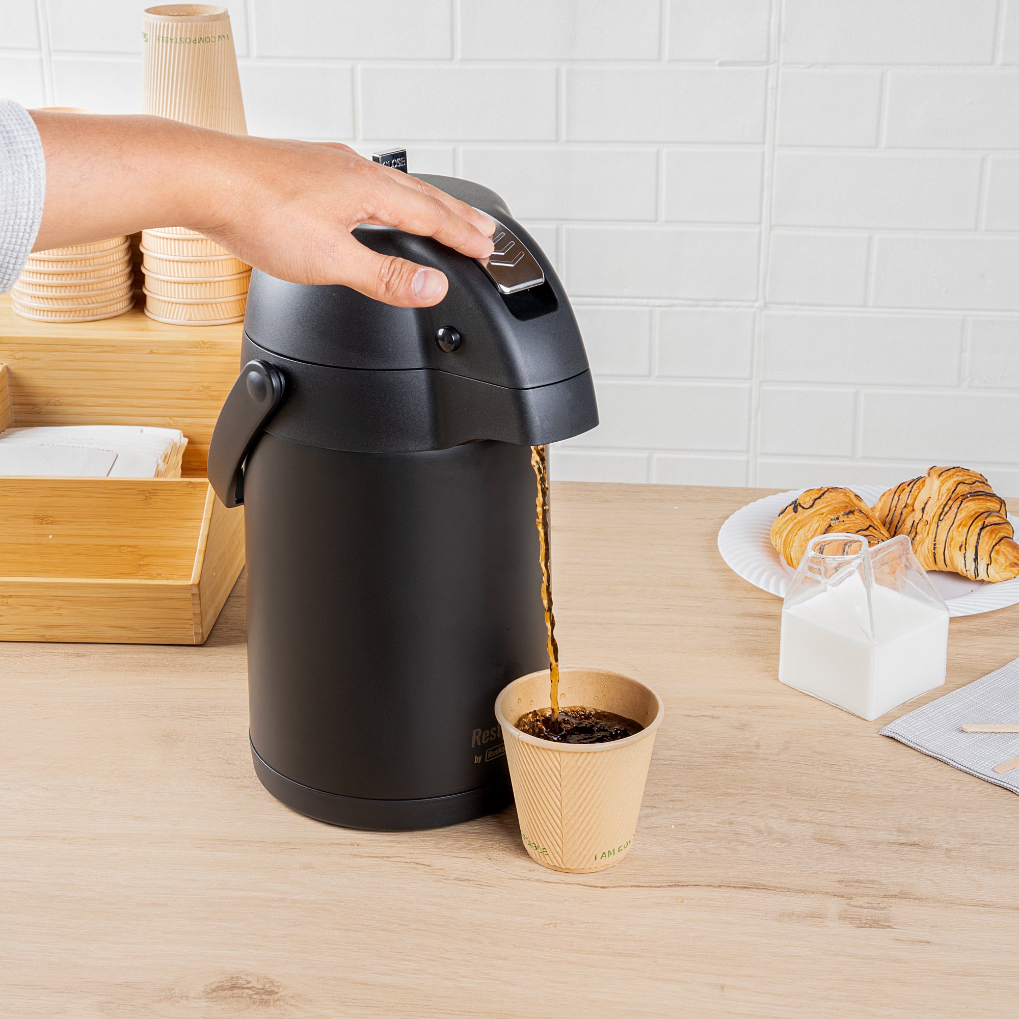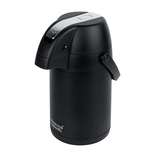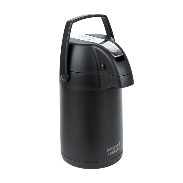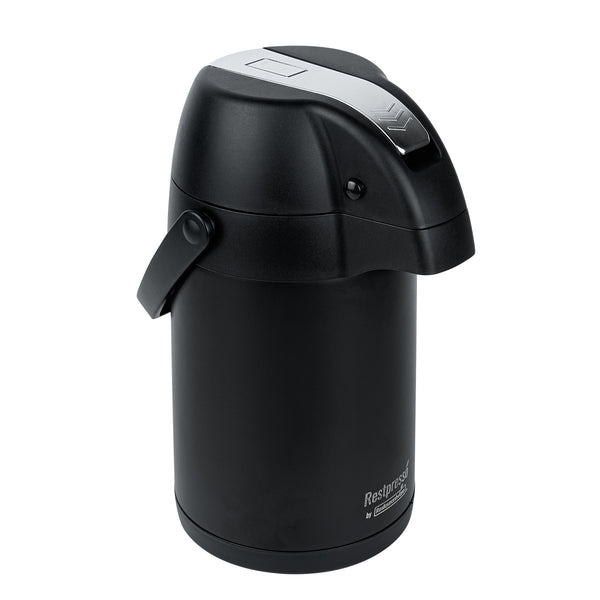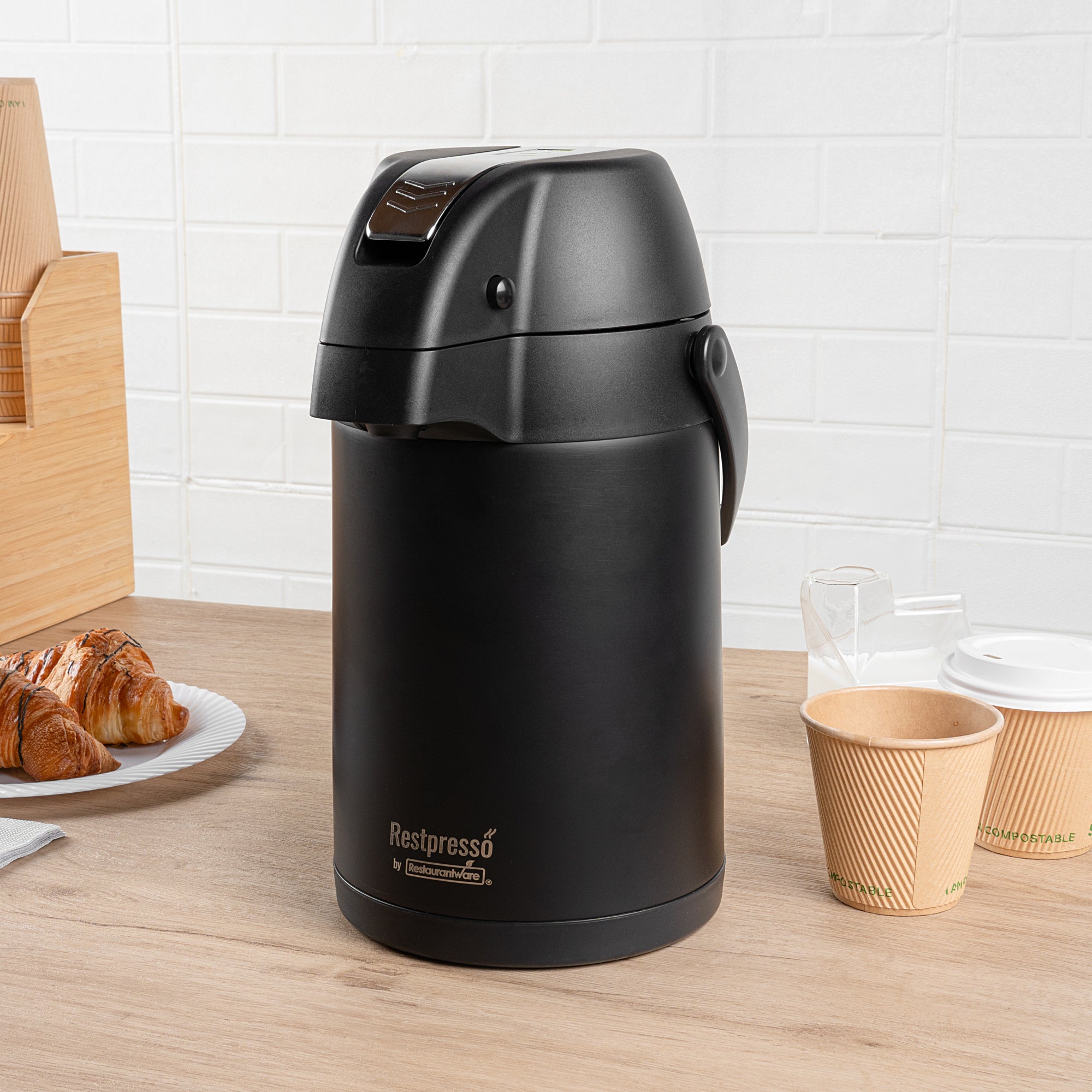 Ensure optimal beverage service with our vacuum insulated airpot. The Restpresso Vacuum Insulation Thermal Coffee Carafe combines advanced vacuum insulation technology with a sleek black exterior, maintaining hot coffee temperatures for up to 12 hours to enhance hospitality experiences. With its substantial 3-liter capacity, this thermal coffee carafe minimizes the need for frequent refills, making it perfect for high-traffic events or bustling breakfast buffets. Its user-friendly pump mechanism ensures spill-free dispensing, boosting efficiency in fast-paced environments, while the premium stainless steel construction guarantees durability, even with heavy use. The convenient swivel base allows 360-degree rotation, providing easy access from any angle and enhancing user experience in self-serve stations. Elevate your beverage service with this insulated beverage dispenser, designed to keep your coffee station running smoothly. Each order includes 1 Restpresso Vacuum Insulation Thermal Coffee Carafe.