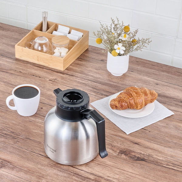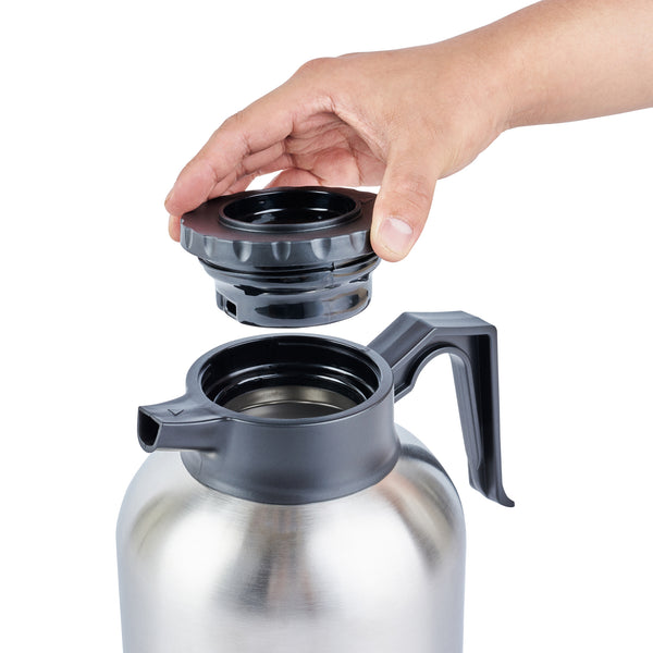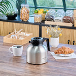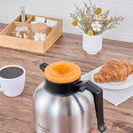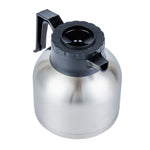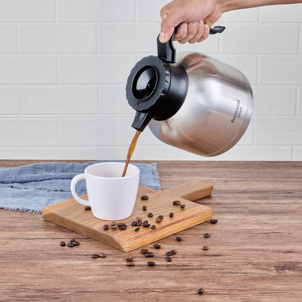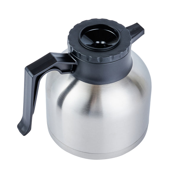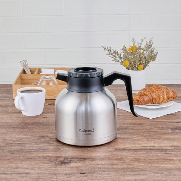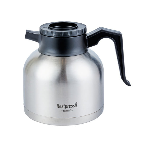 Ensure optimal coffee service with exceptional temperature retention. The Restpresso Insulated Stainless Steel Coffee Carafe, featuring double-wall insulation, maintains beverages at the perfect serving temperature, making it an ideal thermal coffee server for busy foodservice environments. This stainless steel coffee carafe includes both regular and decaf brew-thru lids, allowing your staff to easily distinguish between coffee types, thereby enhancing service efficiency and customer satisfaction. Designed with a sturdy, ergonomic handle, it ensures safe pouring and reduces the risk of spills, making it a reliable hot beverage dispenser for bustling cafes and catering events. Measuring 8.7 inches in length, this carafe's sleek, professional appearance complements any setting while its durable construction withstands daily use. Invest in this essential beverage service tool to elevate your coffee station's functionality. Each order includes 1 Restpresso Insulated Stainless Steel Coffee Carafe.