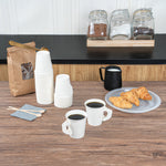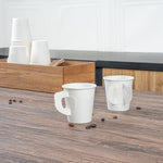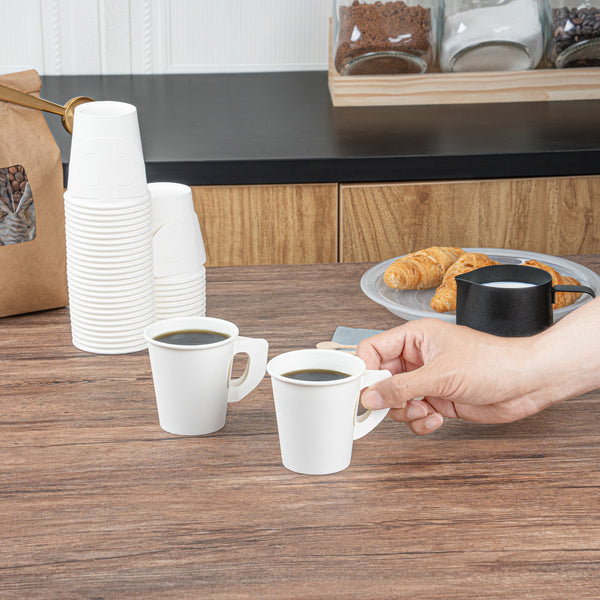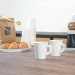 Ensure safe handling of hot beverages with ergonomic design. The Restpresso Paper Coffee Cup with Handle offers a greaseproof coating that prevents the cup from becoming soggy, making it ideal for serving hot drinks. This 7oz paper coffee cup features an ergonomic handle, providing comfort and control for coffee shop operators and event caterers who need to manage drinks efficiently. With a rolled rim, this disposable coffee cup with handle helps prevent collapse, ensuring reliable use during busy service times. Its white color and 2.8-inch by 3-inch dimensions offer a clean, professional appearance suitable for various settings. Elevate your beverage service with this hot beverage cup, providing a sustainable and practical solution. Each order includes 100 Restpresso Paper Coffee Cups with Handle.