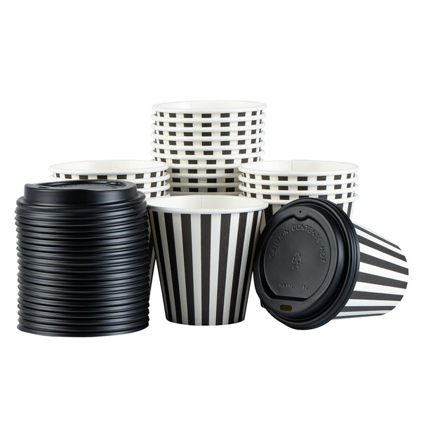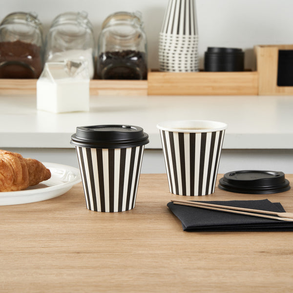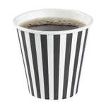 Start your day with our Restpresso 8-ounce Black and White Stripe Paper Single Wall Coffee Cups. Made from durable, single-use coffee cups, these vessels are designed to efficiently serve hot or cold beverages with ease. The greaseproof PE liner in these paper coffee cups ensures your favorite beverages remain contained and mess-free, making them an essential addition to any bustling coffee shop or cafe. With a unique black and white striped finish, these disposable hot cups add a touch of style to your beverage service while also making a bold statement. Designed for convenience, these single wall coffee cups come with a black lid, providing an extra layer of protection against accidental spills. Plus, the rolled rim and leak-resistant seam of these disposable coffee cups ensure every sip is a pleasure, without any unexpected drips or leaks. These paper coffee cups, with a capacity of 8 ounces, are perfect for serving standard servings of coffee, tea, or any other preferred beverage. Easy to store, these stackable coffee cups are a space-saving solution for your business. Pair up these premium-quality coffee cups with our versatile sleeve collection, ensuring a luxurious and comfortable hold. With dimensions of 3.5 inches in diameter by 3.5 inches in height, these recyclable hot tea cups are perfectly sized to fit in car cup holders and coffee machines. Sold in a 20 count box. Sleeves are available and sold separately.