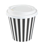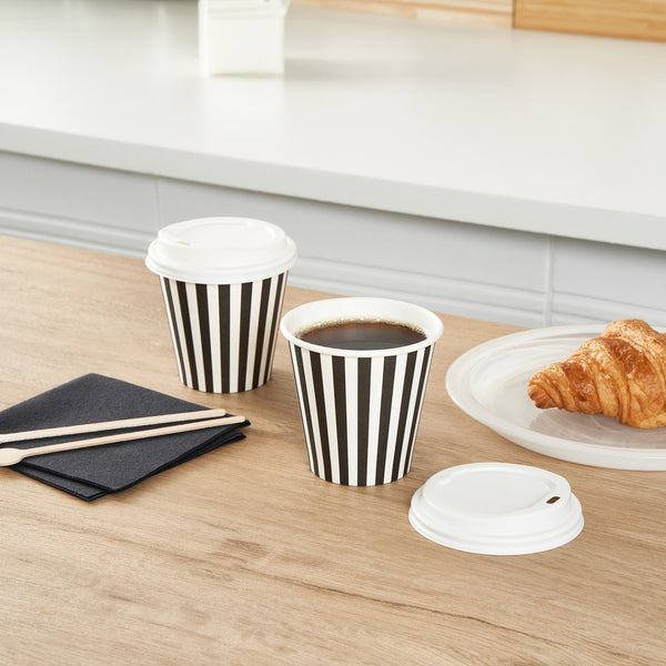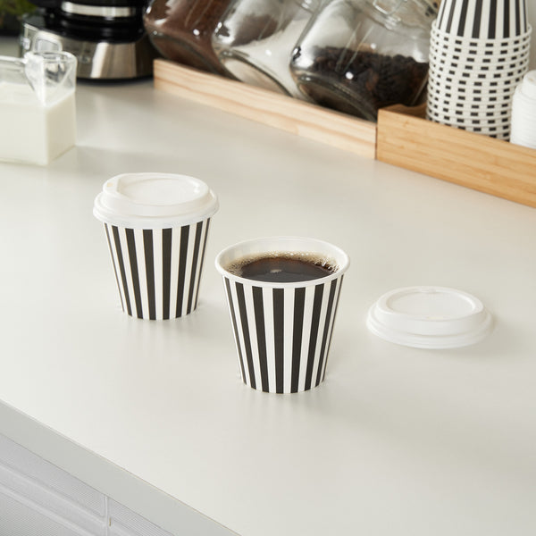 Upgrade your beverage service with our Restpresso 8-ounce Black and White Stripe Paper Single Wall Coffee Cups. Designed to impress, these paper coffee cups feature an eye-catching black and white striped finish that adds a touch of sophistication to your coffee shop, cafe, or food truck. Constructed with a greaseproof PE liner, these disposable hot cups avert leaks and maintain the freshness of your beverages. These single wall coffee cups come with a leakproof white lid and are perfect for serving hot or cold drinks, ensuring your customers can enjoy their favorite beverages. These stackable coffee cups help save valuable storage space while promoting organization in your establishment. The rolled rim of these single-use coffee cups ensures a comfortable drinking experience, while the leak-resistant seam minimizes any accidental spills. Match these coffee cups with our assortment of sleeves designed to shield your hands from the heat of a hot drink. Boasting an 8-ounce capacity and measuring 3.5 inches in diameter by 4.25 inches in height, these recyclable coffee cups are the perfect size for serving small-sized beverages to your on-the-go customers. Sold in a 20 count box. Sleeves are available and sold separately.