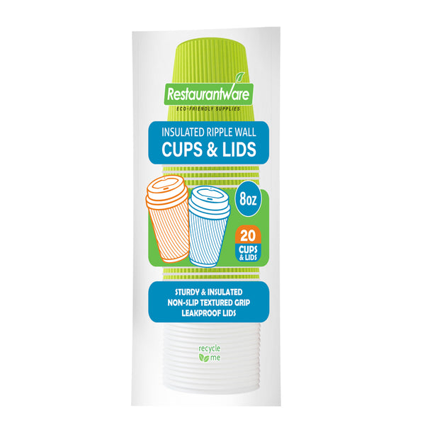 Ensure a confident grip with our eco-friendly coffee solution. Restpresso 8 oz Eco Green Paper Ripple Wall Coffee Cups provide a ripple wall design that ensures a secure grip for hot drinks while eliminating the need for additional sleeves, perfect for foodservice environments requiring 8 oz paper coffee cups. These disposable coffee cups with lids are crafted from sustainable paper, underscoring eco-conscious business practices by being both recyclable and designed to prevent spills, maintaining beverage temperature during transport. The cups' cold and hot food-friendly construction supports diverse menu offerings, making them ideal for cafés that serve a variety of beverages. Measuring 3.6 inches in width and height, the ripple wall coffee cups offer built-in insulation, keeping hands cool and drinks hot. Embrace sustainability in your coffee shop with these versatile, eco-conscious drinkware options. Sold in a 20 count box.