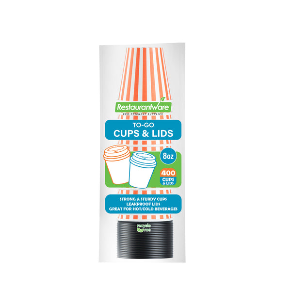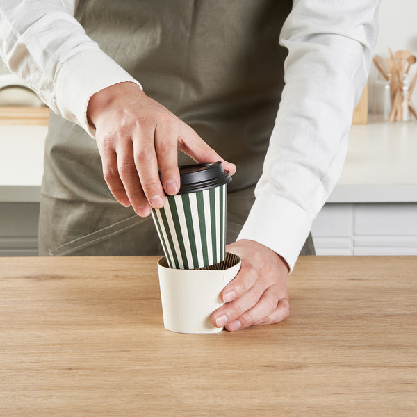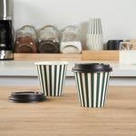 Serve up your signature hot or cold beverages easily using our Restpresso 8-ounce Forest Green and White Stripe Paper Single Wall Coffee Cups. These paper coffee cups, featuring a stylish forest green and white striped finish, will add a touch of elegance to your coffee service while ensuring a comfortable hold for your customers. Designed with a single-wall construction, these disposable coffee cups are suitable for all kinds of beverages. These single-use coffee cups feature a leak-resistant seam and rolled rim that ensures mess-free sipping and is perfect for on-the-go customers. Stackability is another notable feature of these paper drinking cups, making storage and transport a breeze. Included with a black lid and a greaseproof PE liner, these beverage cups reduce leaks and spills. Couple these whimsical coffee cups with our diverse sleeve options, adding a touch of fantasy to your coffee enjoyment. With a capacity of 8 ounces and dimensions of 3.5 inches in diameter by 3.5 inches in height, these recyclable hot tea cups are just the right size for all your beverages. Sold in a 400 count box. Sleeves are available and sold separately.