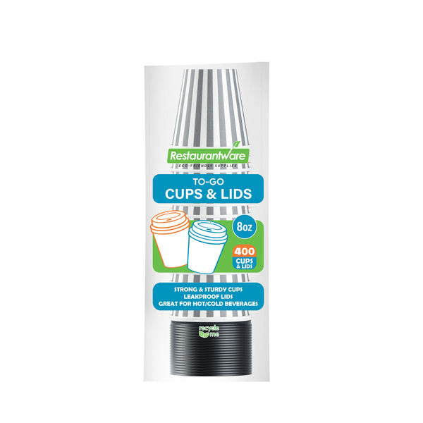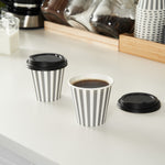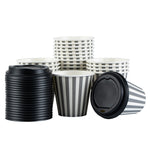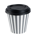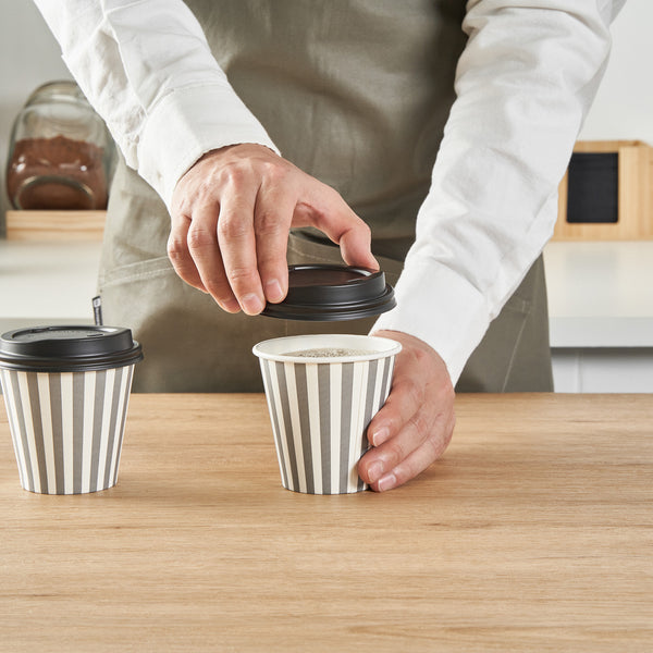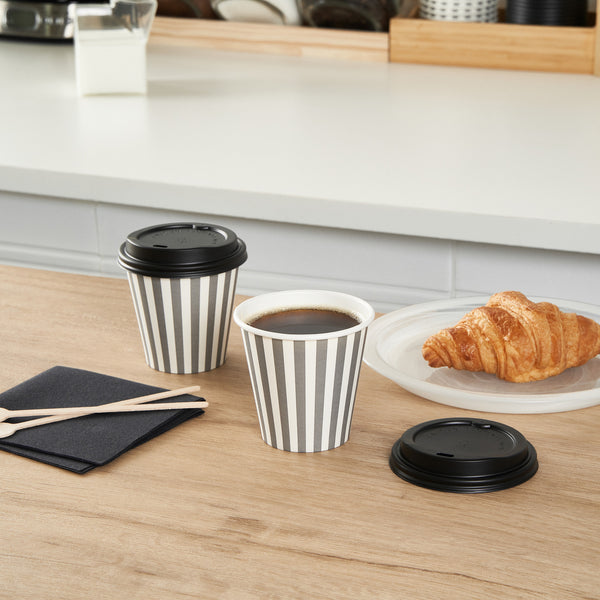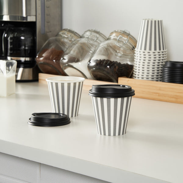Serve your coffee in style with our Restpresso 8-ounce Gray and White Stripe Paper Single Wall Coffee Cups. These paper coffee cups are designed with a greaseproof PE liner, ensuring that your beverages have no leaks or seepage. Plus, these disposable hot cups are perfectly suited for both hot and cold beverages, offering flexibility for your culinary needs. Crafted with a single wall, these coffee cups efficiently hold all kinds of beverages. Featuring an eye-catching gray and white striped finish, these recyclable hot tea cups add an elegant touch to your beverage service. To ensure no spills or accidents, these stackable coffee cups come with a black lid and feature a rolled rim for a secure fit. The leak-resistant seam on these disposable paper cups further enhances their reliability and utility. Coordinate these artistic coffee cups with our assortment of sleeves, ensuring a creative and heat-resistant coffee ritual. With a generous capacity of 8 ounces, these beverage cups can comfortably hold your specialty beverages, while their compact dimensions of 3.5 inches in diameter by 3.5 inches in height make them easy to handle. Sold in a 20 count box. Sleeves are available and sold separately.