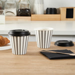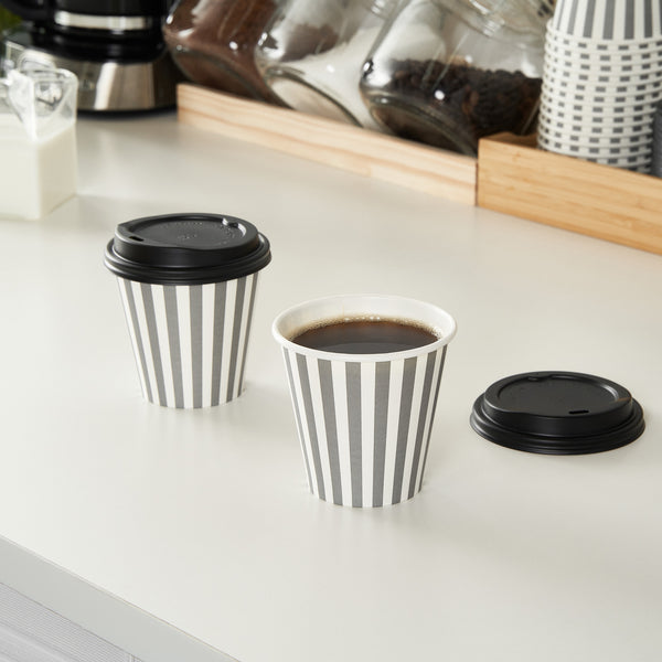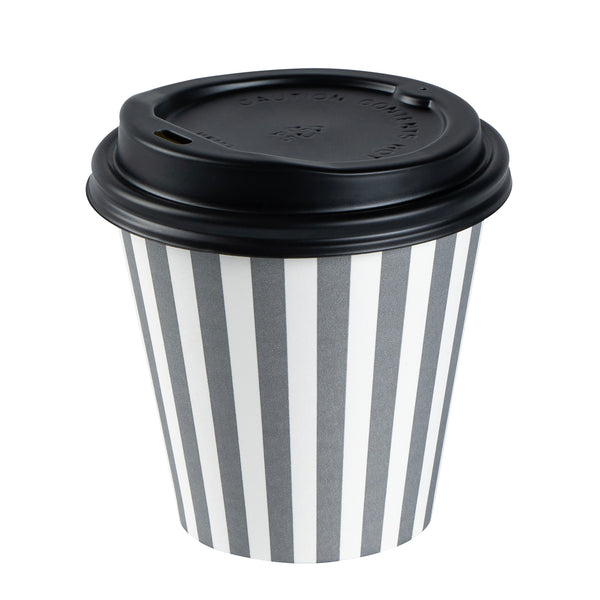 Serve your coffee in style with our Restpresso 8-ounce Gray and White Stripe Paper Single Wall Coffee Cups. These paper coffee cups are designed with a greaseproof PE liner, ensuring that your beverages have no leaks or seepage. Plus, these disposable hot cups are perfectly suited for both hot and cold beverages, offering flexibility for your culinary needs. Crafted with a single wall, these coffee cups efficiently hold all kinds of beverages. Featuring an eye-catching gray and white striped finish, these recyclable hot tea cups add an elegant touch to your beverage service. To ensure no spills or accidents, these stackable coffee cups come with a black lid and feature a rolled rim for a secure fit. The leak-resistant seam on these disposable paper cups further enhances their reliability and utility. Coordinate these artistic coffee cups with our assortment of sleeves, ensuring a creative and heat-resistant coffee ritual. With a generous capacity of 8 ounces, these beverage cups can comfortably hold your specialty beverages, while their compact dimensions of 3.5 inches in diameter by 3.5 inches in height make them easy to handle. Sold in a 400 count box. Sleeves are available and sold separately.
