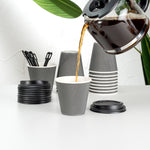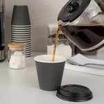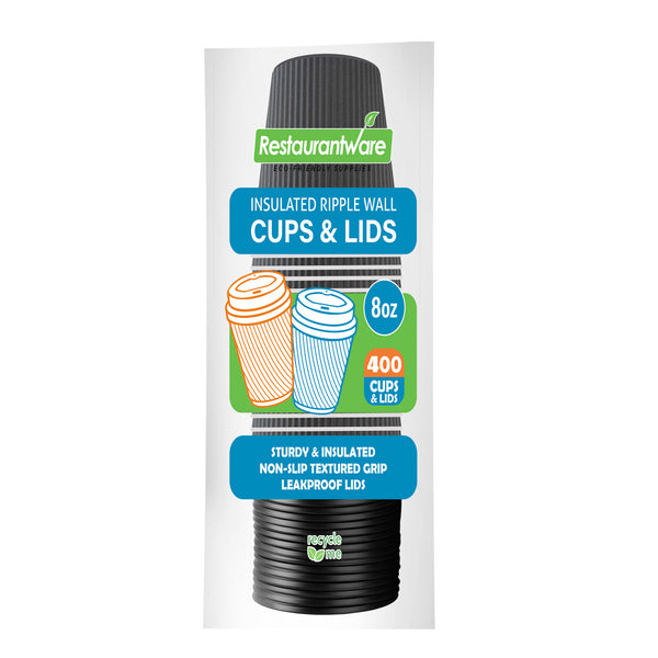 Ensure optimal beverage service with heat-retaining ripple wall coffee cups. The Restpresso 8 oz Gray Paper Ripple Wall Coffee Cups, measuring 3.6 inches by 3.6 inches by 4.1 inches, are crafted from sturdy paper and feature a ripple wall design that insulates drinks, eliminating the need for additional sleeves and keeping beverages hot and ready to enjoy. These paper coffee cups with lids include secure black lids that prevent spills, making them ideal for coffee to-go cups in bustling cafés or busy catering events. With a greaseproof lining, these cups are not only perfect for coffee but also suitable for serving hot soups and stews. Enhance your drink presentation with the stylish gray finish while ensuring convenience and safety during transport. Elevate your beverage service today with these versatile coffee to-go cups. Sold in a 400 count box.
