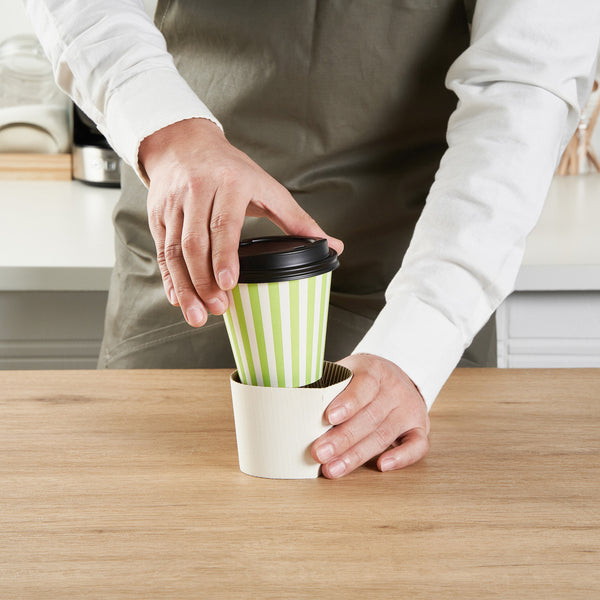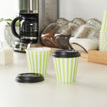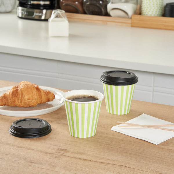 Start your day on a high note with our Restpresso 8-ounce Green and White Stripe Paper Single Wall Coffee Cups. Featuring a greaseproof PE liner, these paper coffee cups ensure an unsoiled and enjoyable drinking experience. Add a touch of style to your beverage service with their unique green and white striped finish, turning every sip into a visual delight. Crafted for convenience, these disposable hot cups come with a black lid, minimizing spills and keeping your drink hot for longer. Boasting a single wall design, these stackable coffee cups offer the perfect balance between durability and insulation, keeping your beverages at the right temperature. For hot and cold drinks, these single-use coffee cups are versatile, catering to all your beverage needs. With a rolled rim and leak-resistant seam, these recyclable hot tea cups ensure a comfortable and secure grip, providing a comfortable coffee experience. Connect these coffee cups with our variety of sleeves, offering both personality and heat protection for your drink. With a capacity of 8 ounces, these disposable coffee cups measure 3.5 inches in diameter by 3.5 inches in height, perfect for on-the-go customers. Sold in a 400 count box. Sleeves are available and sold separately.