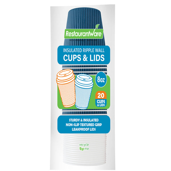 Deliver hot beverages securely with Restpresso 8 oz Midnight Blue Paper Ripple Wall Coffee Cups. These disposable coffee cups, constructed from insulated paper, keep drinks hot while remaining cool to the touch, ensuring comfort for customers and staff. The ripple wall design offers a sturdy non-slip grip, minimizing accidental spills and enhancing safety in busy coffee shops. Equipped with white lids, these coffee cups with lids create a tight-fitting seal, preventing leaks and maintaining beverage temperature during transit. Each cup measures 3.6 inches in diameter, providing a convenient fit in most standard cup holders, which is essential for catering and on-the-go service. The eco-friendly and recyclable nature of these cups supports sustainability efforts in foodservice operations, appealing to environmentally conscious patrons. Enhance your café’s beverage service with these ripple wall coffee cups for a stylish and practical solution. Sold in a 20 count box.