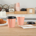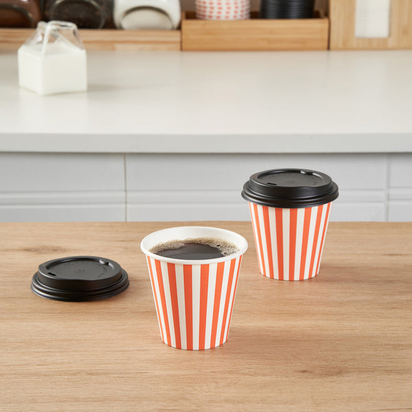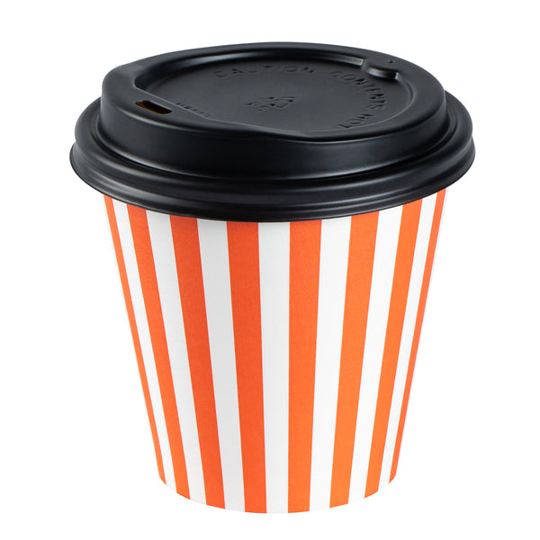 Serve your customers' favorite hot or cold beverages in our Restpresso 8-ounce Orange and White Stripe Paper Single Wall Coffee Cups. These paper coffee cups are designed with a greaseproof PE liner, ensuring your customers can enjoy their drinks without worrying about leaks or spills. Featuring a single-wall design, these disposable hot cups holds all kinds of beverages. With their stylish orange and white striped finish, these single-wall coffee cups add a touch of elegance to your beverage offerings. These disposable coffee cups have black lids that fit securely, averting spills during transport. These stackable cups also save valuable storage space in your establishment. The rolled rim of these recyclable hot tea cups provides a comfortable drinking experience for your customers, while their leak-resistant seam ensures the integrity of your drinks. Pair these coffee cups with our versatile sleeve collection, adding sustainability and comfort to your coffee break. With a generous capacity of 8 ounces, these recyclable hot tea cups are perfect for serving a variety of beverages. Measuring 3.5 inches in diameter by 3.5 inches in height, these stackable coffee cups are the ideal size for takeaway drinks. Sold in a 20 count box. Sleeves are available and sold separately.