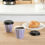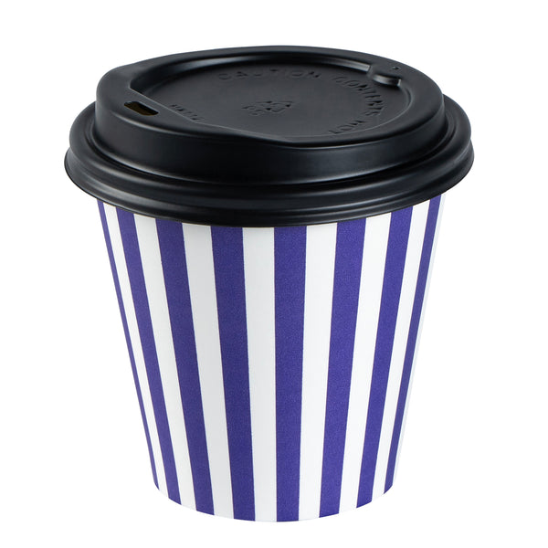 Our Restpresso 8-ounce Purple and White Stripe Paper Single Wall Coffee Cups are the perfect fusion of style and functionality for your beverage service needs. Featuring a leakproof black lid, these paper coffee cups ensure no unpleasant leaks, enhancing the customer experience. With a greaseproof PE lining, these disposable hot cups withstand both hot and cold beverages, making them a versatile choice for cafes, coffee shops, and more. The distinctive purple and white stripe finish of these single wall coffee cups adds a touch of elegance to your service, setting you apart from the competition. These stackable single-use coffee cups maximize storage space, an essential feature for busy foodservice establishments. The rolled rim of these recyclable hot tea cups offers comfortable sipping, while the leak-resistant seam ensures a mess-free experience. Combine these durable coffee cups with our lineup of sleeves for a robust and safe grip during your coffee moments. These single-use coffee cups have an 8-ounce capacity, perfect for serving small to medium-sized beverages, and measure 3.5 inches in diameter by 3.5 inches in height, easily fitting in most cup holders for on-the-go convenience. Sold in a 20 count box. Sleeves are available and sold separately.