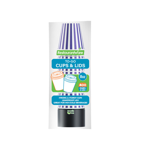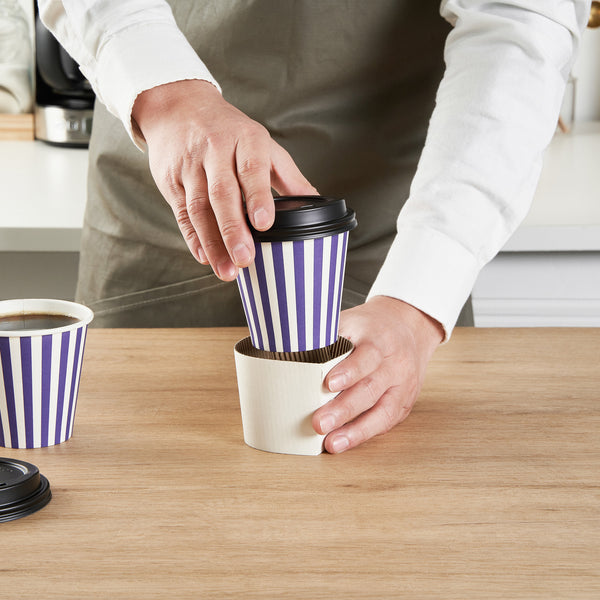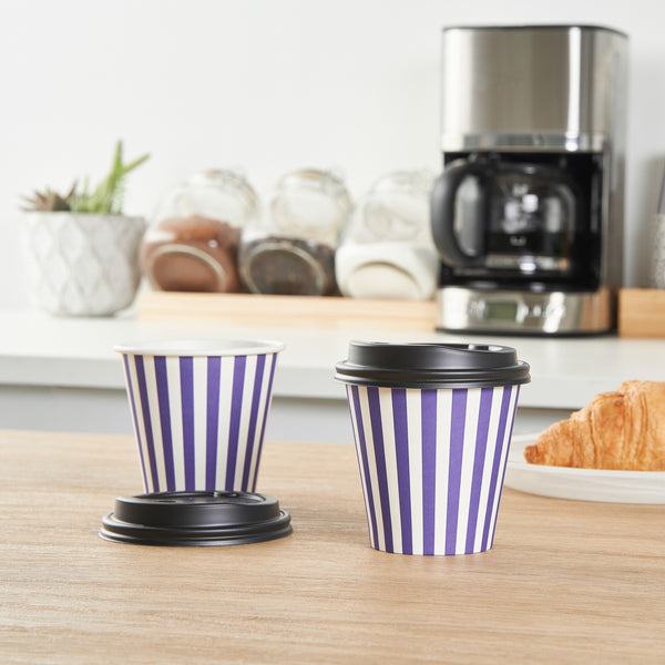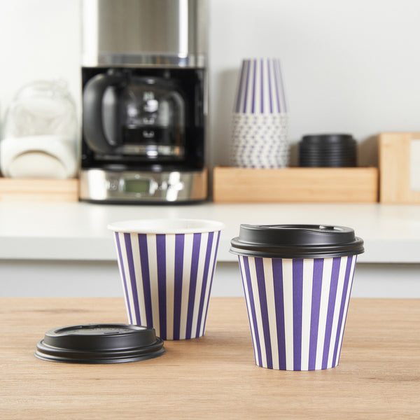 Our Restpresso 8-ounce Purple and White Stripe Paper Single Wall Coffee Cups are the perfect fusion of style and functionality for your beverage service needs. Featuring a leakproof black lid, these paper coffee cups ensure no unpleasant leaks, enhancing the customer experience. With a greaseproof PE lining, these disposable hot cups withstand both hot and cold beverages, making them a versatile choice for cafes, coffee shops, and more. The distinctive purple and white stripe finish of these single wall coffee cups adds a touch of elegance to your service, setting you apart from the competition. These stackable single-use coffee cups maximize storage space, an essential feature for busy foodservice establishments. The rolled rim of these recyclable hot tea cups offers comfortable sipping, while the leak-resistant seam ensures a mess-free experience. Combine these durable coffee cups with our lineup of sleeves for a robust and safe grip during your coffee moments. These single-use coffee cups have an 8-ounce capacity, perfect for serving small to medium-sized beverages, and measure 3.5 inches in diameter by 3.5 inches in height, easily fitting in most cup holders for on-the-go convenience. Sold in a 400 count box. Sleeves are available and sold separately.