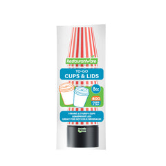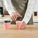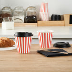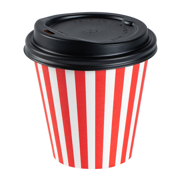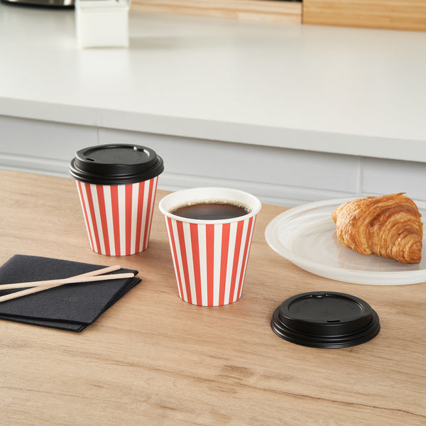 Serve your hot or cold beverages in our Restpresso 8-ounce Red and White Stripe Paper Single Wall Coffee Cups. These paper coffee cups, with their unique red and white stripe design, add a splash of color and style to your beverage service. Sporting a greaseproof PE liner, these disposable hot cups ensure your customers enjoy their drinks without any leakage. The single wall construction of these coffee cups provides sufficient insulation for both hot and cold beverages, making them an adaptable choice for all seasons. Coming with a black lid, these single-use coffee cups offer a secure seal, minimizing any accidental spills during transit. With their stackability, these recyclable hot tea cups save valuable storage space and ensure easy handling. The rolled rim provides a secure drinking experience, while the leak-resistant seam ensures the integrity of the cup. Holding up to 8 ounces of beverage, these hot coffee cups serve small to medium-sized drinks. Match these coffee cups with our array of sleeves, infusing joy, and heat security into your coffee experience. With dimensions of 3.5 inches in diameter by 3.5 inches in height, these single use coffee cups are compact and portable, making them ideal for customers on the go. Sold in a 20 count box. Sleeves are available and sold separately.