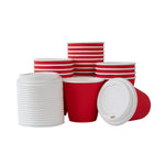 Serve hot beverages safely with red ripple wall coffee cups. Restpresso 8 oz Red Paper Ripple Wall Coffee Cups provide premium insulation to keep drinks hot and hands cool without the need for additional sleeves, making them ideal for busy coffee shops. These disposable coffee cups with lids include matching white lids that ensure a secure fit to prevent spills and maintain the optimal temperature of beverages during transport. The ripple wall design not only offers a sturdy non-slip grip but also reduces heat transfer for safe handling. With a vibrant red color, these cups enhance presentation, adding a festive touch to your service and supporting branding opportunities. Made from durable paper, these hot drink to-go cups are recyclable, facilitating eco-friendly dining operations while providing a reliable option for serving coffee. Each cup measures 3.6 inches in diameter and 4.1 inches in height, supporting diverse menu items with ease. Sold in a 400 count box.