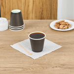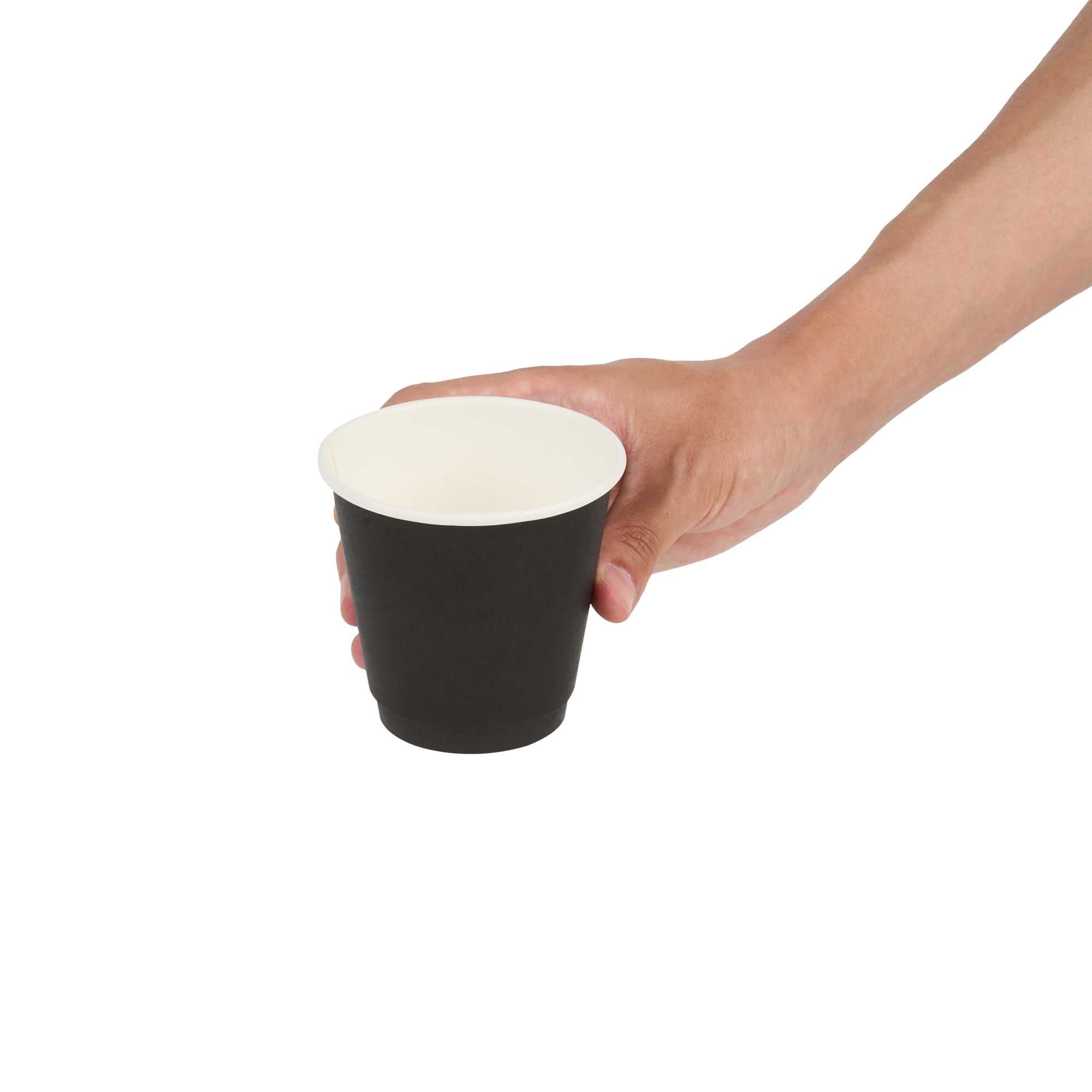 Stay fashionably cool holding our Restpresso 8-ounce Round Black Paper Coffee Cups. Designed with innovative double walls, these hot paper cups are built to keep drinks warm while keeping hands cool. With the matching lids (SKUs: RWA0328HP, RWA0283B, RWA0283W), these hot drink cups can instantly turn into take out cups. Made with premium paper, these paper coffee cups are recyclable, reducing your carbon footprint. Durable and sturdy, these hot beverage cups can hold hot drinks for a long time. With a black finish, these disposable coffee cups are an excellent size for serving small macchiatos or green tea lattes at any coffee shop. These recyclable paper cups hold up to 8 ounces and measure 3.5 inches in diameter by 3.25 inches in height. Shipped in a 500 count box. Lids are available and sold separately.