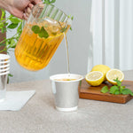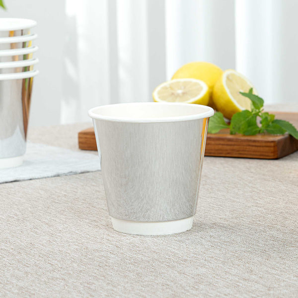 Upgrade your beverage service with our Restpresso 9-ounce Metallic Silver Paper Hot / Cold Cups. These stylish disposable party cups feature a sleek metallic silver finish that adds a touch of sophistication to any occasion. Designed to handle both hot and cold beverages, they offer excellent versatility for serving coffee, tea, cocktails, and more. Crafted from durable paper, these cups maintain their shape and integrity during use, ensuring a reliable drinking experience. Their freezer-safe construction also makes them perfect for preparing and storing chilled drinks or desserts in advance. Whether you're hosting a birthday party, wedding, corporate event, or casual gathering, these disposable cups are a convenient and elegant solution. These cups measure 2.28 inches in diameter by 3.39 inches in height with a 9-ounce capacity. Sold in a 25 count box.